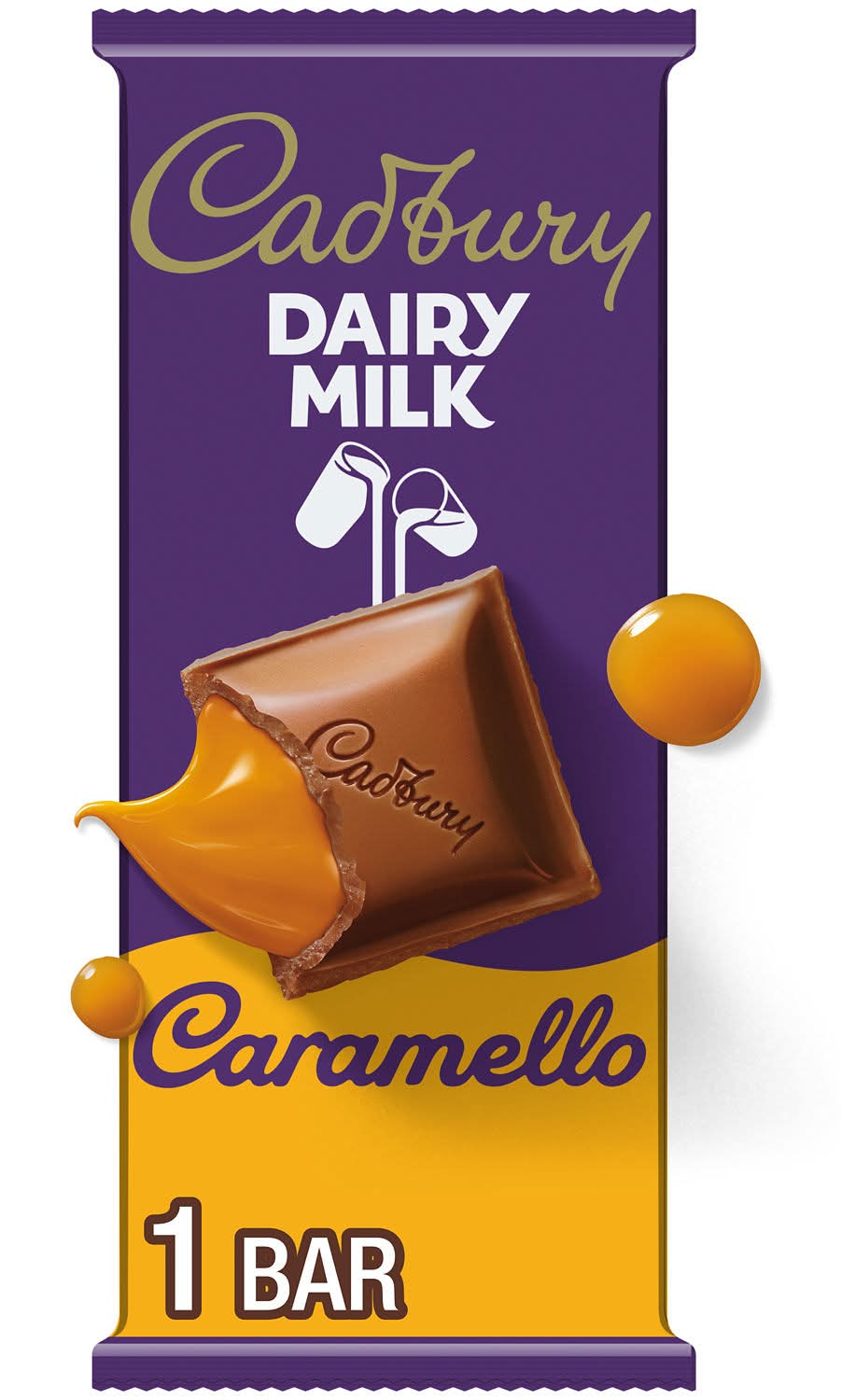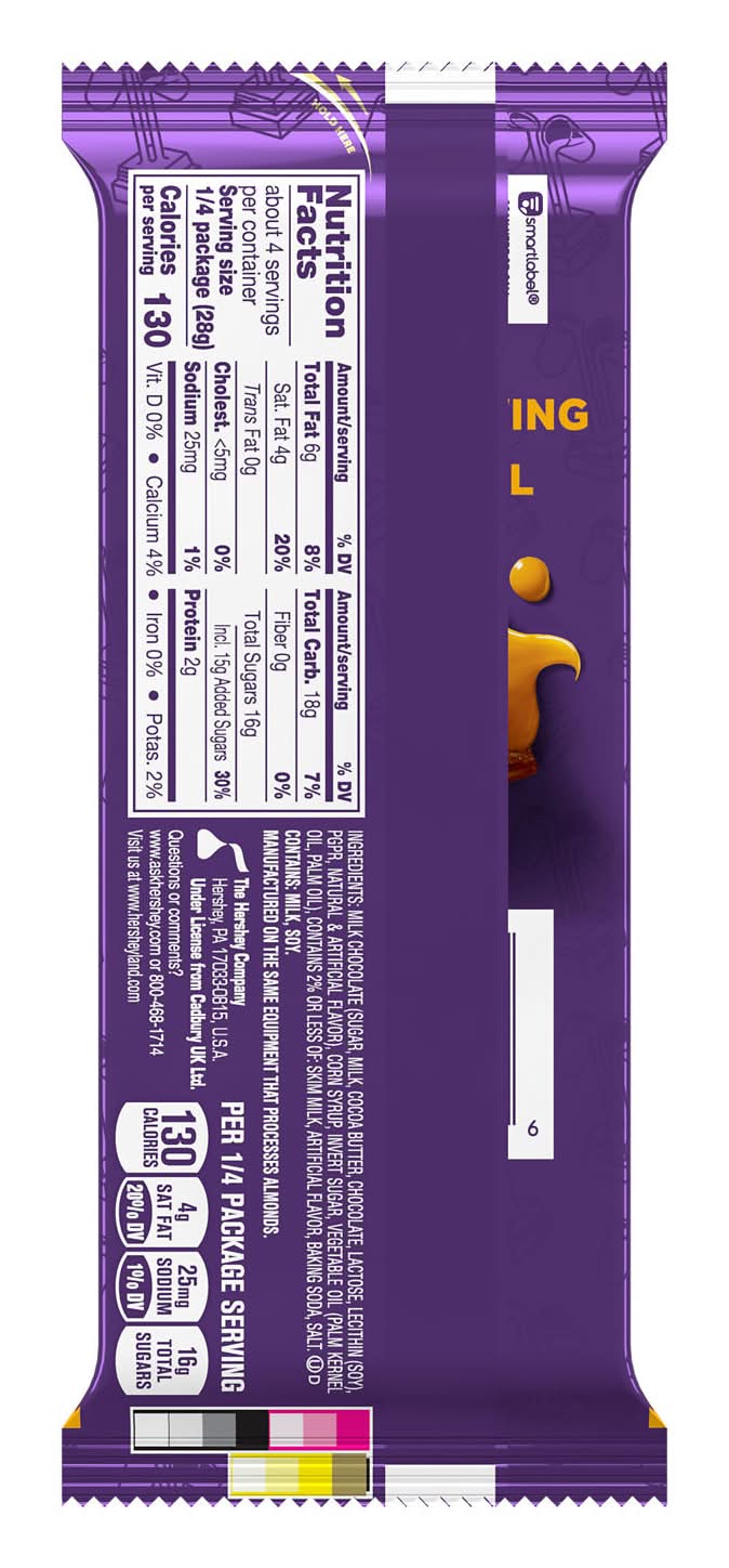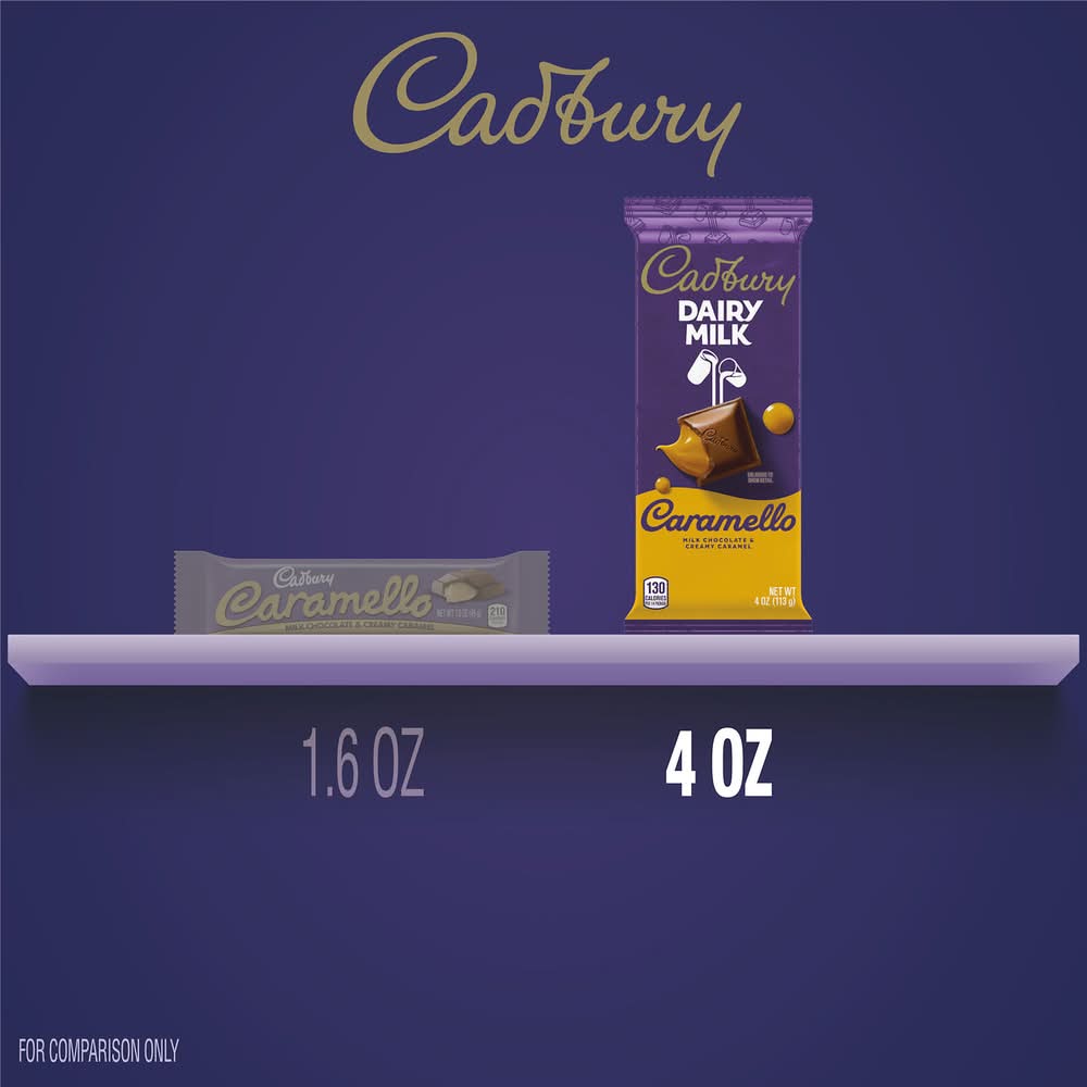 Cadbury Dairy Milk Caramello candy bars are made with rich and creamy milk chocolate filled with a deliciously smooth caramel. These bars are great for keeping your kitchen pantry or desk drawer stocked with sweet treats for easy access throughout the day. Whether you enjoy this delicious milk chocolate candy alone or share it with co-workers, friends and family members, it's sure to live up to your highest dessert expectations from the very first bite. Share and savor each taste of sweet and creamy caramel chocolate goodness chilled in the fridge, added to baked goods, paired with popcorn at movie night or enjoyed straight from the wrapper for a treat like no other. Throw a few sections on top of your best brownies, cookies or ice cream sundaes for an extra decadent dessert those around you will love after lunch or dinner. Looking for a delicious, chocolatey way to celebrate special occasions. Use Cadbury Dairy Milk Caramello treats to stuff Christmas stockings, fill springtime Easter baskets, pass out for Halloween trick-or-treating nights and share with loved ones on Valentine's Day. Have a bite of this dreamy chocolate and caramel treat for yourself and you'll understand. • Flavor: Caramello • The Hershey Company, Hershey, PA.