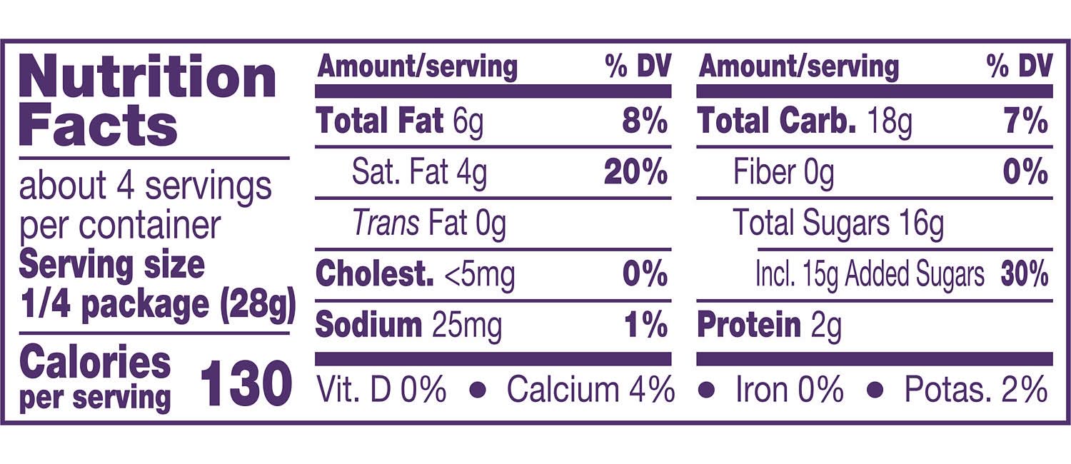 Ingredients: Milk Chocolate (Sugar, Milk, Cocoa Butter, Chocolate, Lactose, Lecithin (Soy), PGPR, Natural & Artificial Flavor), Corn Syrup, Invert Sugar, Vegetable Oil (Palm Kernel Oil, Palm Oil), Contains 2% or Less of: Skim Milk, Artificial Flavor, Baking Soda, Salt Contains: Milk, Lactose, Soybeans, Tree Nuts