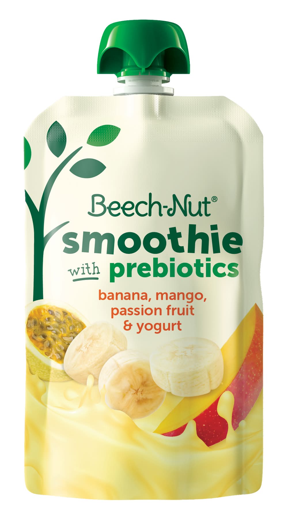 Beech-Nut Smoothie with Prebiotics Passion Fruit & Yogurt is a blend of fruit and whole milk yogurt designed for children aged 12 months and older. It is made with ingredients that are not genetically modified and the yogurt is pasteurized after culturing. The product contains no added sweeteners and is produced in Chile. Flavor: Banana, mango