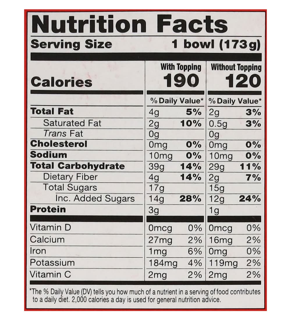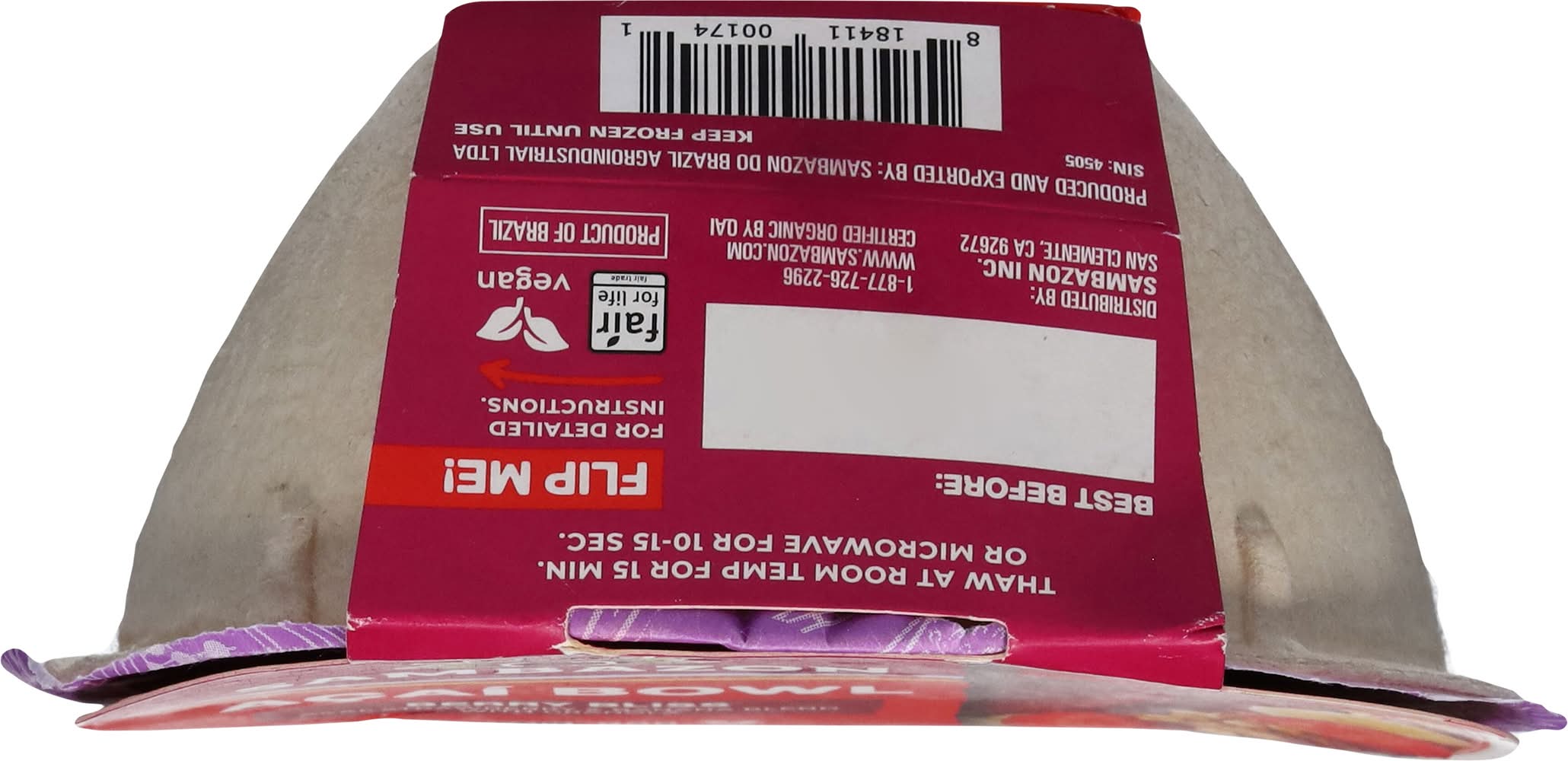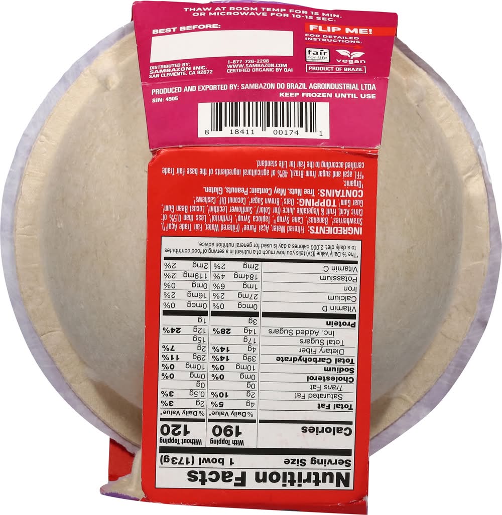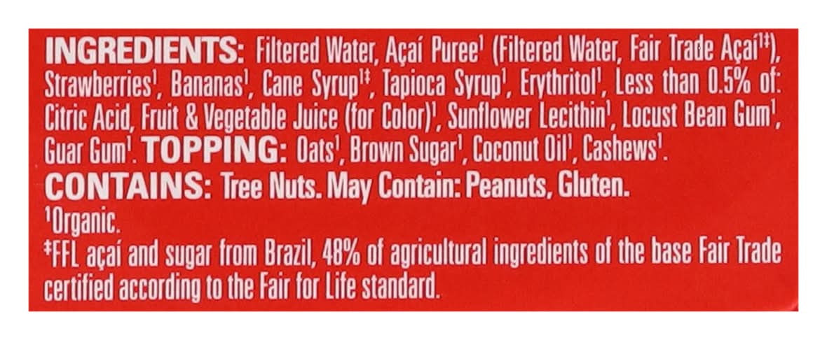 Ingredients: Filtered Water, Acai Puree(1) (Filtered Water, Fair Trade Acai(1)(a)), Strawberries(1), Bananas(1), Cane Syrup(1)(a), Tapioca Syrup(1), Erythritol(1), Less than 0.5% of: Citric Acid, Fruit & Vegetable Juice (for Color)(1), Sunflower Lecithin(1), Locust Bean Gum(1), Guar Gum(1). Topping: Oats(1), Brown Sugar(1), Coconut Oil(1), Cashews(1). (1) Organic. (a) FFL Acai and Sugar from Brazil, 48% of Agriculture Ingredients of the Base Fair Trade Certified According to the Fair for Life Standard Contains: Tree Nuts, Oat, Tree Nuts, Cashews, Peanuts, Gluten