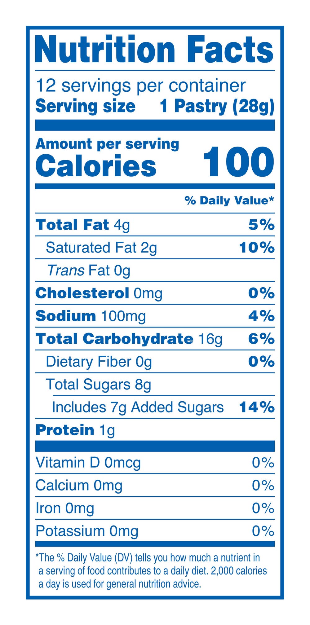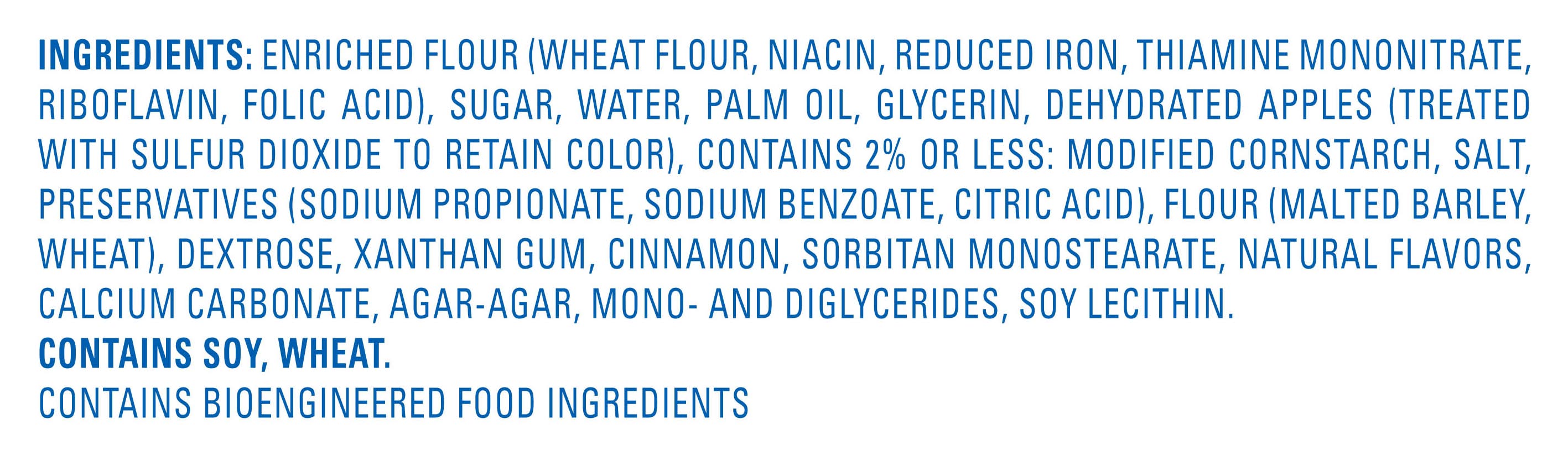 Ingredients: Enriched Flour (Wheat Flour, Niacin, Reduced Iron, Thiamine Mononitrate, Riboflavin, Folic Acid), Sugar, Water, Palm Oil, Glycerin, Dehydrated Apples (Treated with Sulfur Dioxide to Retain Color), Contains 2% or Less: Modified Cornstarch, Salt, Preservatives (Sodium Propionate, Sodium Benzoate, Citric Acid), Flour (Malted Barley, Wheat), Dextrose, Xanthan Gum, Cinnamon, Sorbitan Monostearate, Natural Flavors, Calcium Carbonate, Agar-Agar, Mono- and Diglycerides, Soy Lecithin Contains: Contains Soy, Wheat. Contains Bioengineered Food Ingredients.