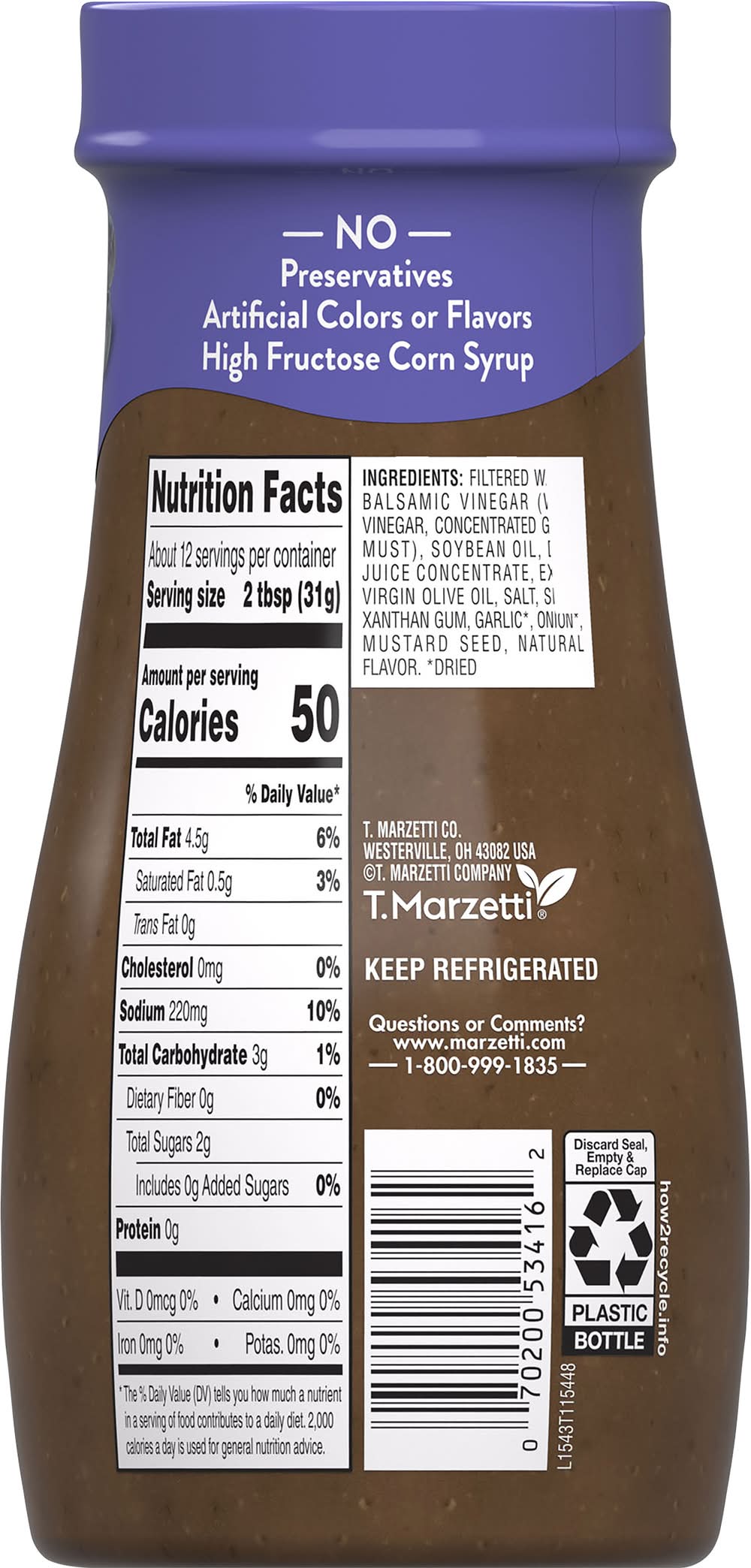 Ingredients: Filtered W Balsamic Vinegar (Wine Vinegar, Concentrated Grape Must), Soybean Oil, Date Juice Concentrate, Extra Virgin Olive Oil, Salt, Spice Xanthan Gum, Garlic (Dried), Onion (Dried), Mustard Seed, Natural Flavor Contains: Soybeans, Mustard