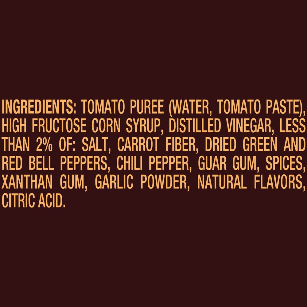 Ingredients: Tomato Puree (Water, Tomato Paste), High Fructose Corn Syrup, Distilled Vinegar, Corn Syrup, Less than 2% of: Salt, Sugar, Carrot Fiber, Dried Green and Red Bell Peppers, Chili Pepper, Guar Gum, Spices, Xanthan Gum, Dried Garlic, Natural Flavors, Citric Acid. Contains: Corn