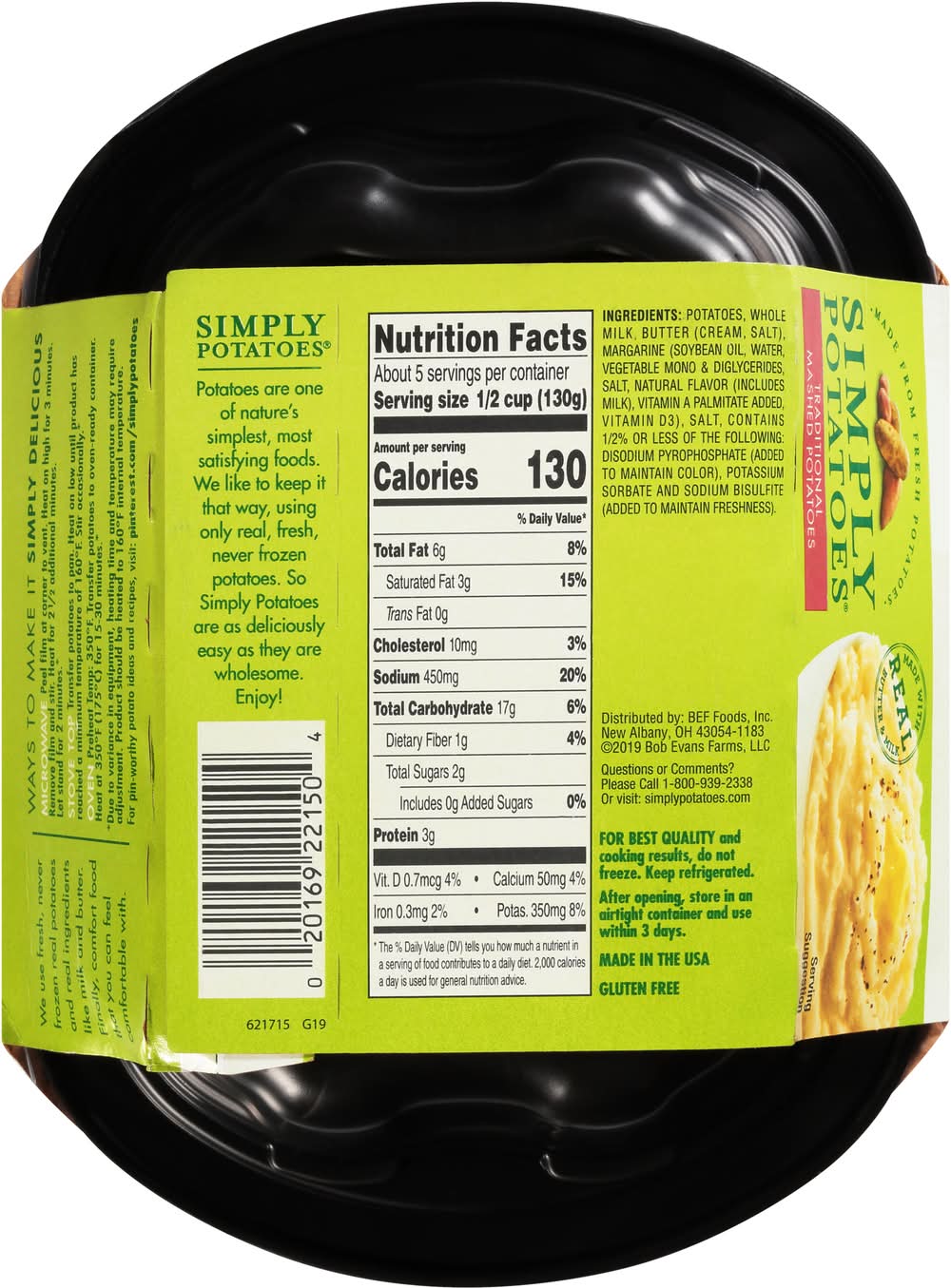 Gluten free. Potatoes are one of nature's simplest foods. We like to keep it that way, using only real, fresh, never frozen potatoes. So simply potatoes are as deliciously easy as they are wholesome. Enjoy!. We use fresh, never frozen real potatoes and real ingredients like milk and butter. Finally, comfort food that you can feel comfortable with. BEF Foods, Inc., New Albany, OH, 43054-1183