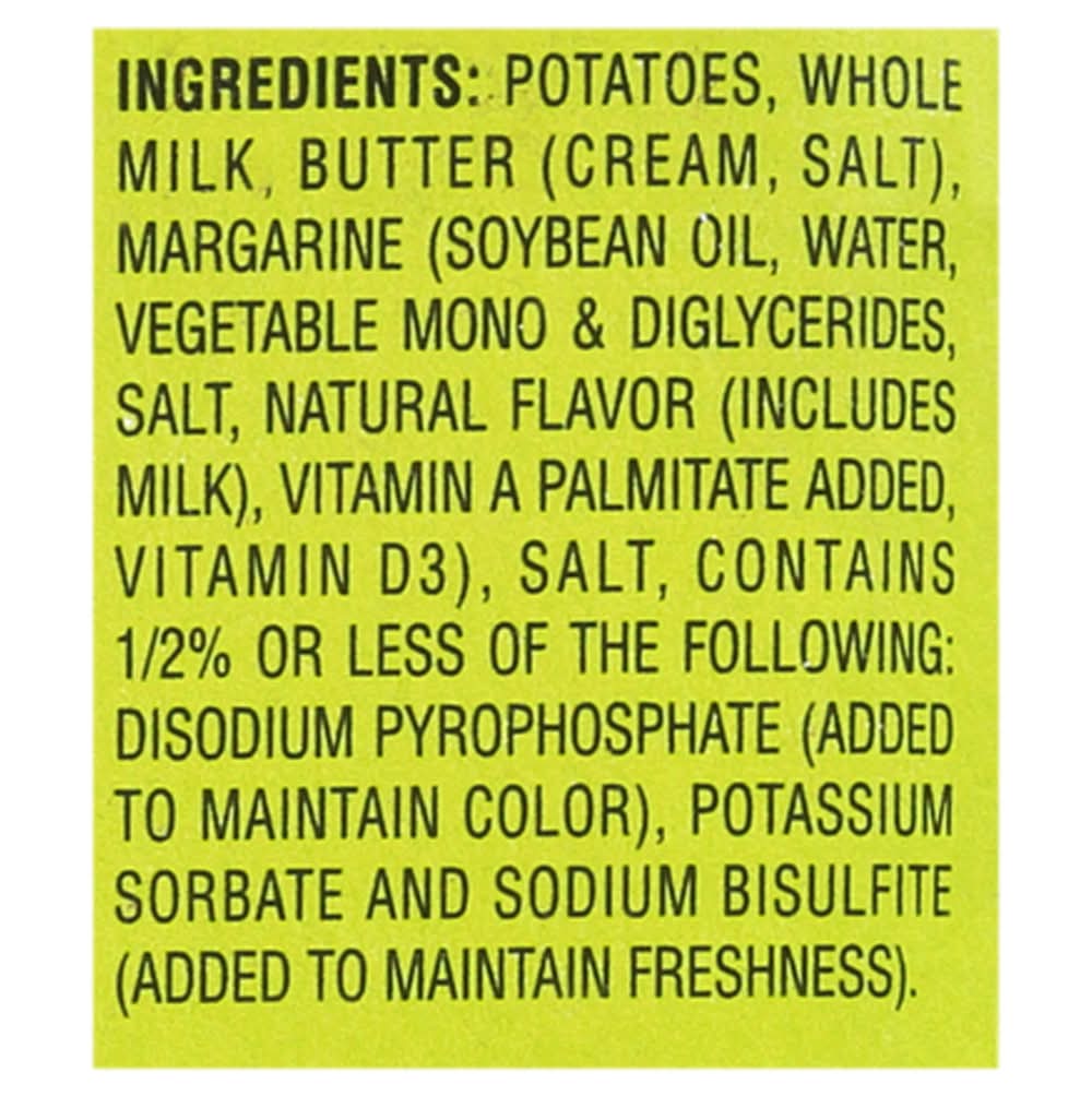 Ingredients: Potatoes, Whole Milk, Butter (Cream, Salt), Margarine (Soybean Oil, Water, Vegetable Mono & Diglycerides, Salt, Natural Flavor (Includes Milk), Vitamin A Palmitate Added, Vitamin D3), Salt, Contains 1/2% or Less of the Following: Disodium Pyrophosphate (Added to Maintain Color), Potassium Sorbate and Sodium Bisulfite (Added to Maintain Freshness) Contains: Milk, Soybeans, Sulfites