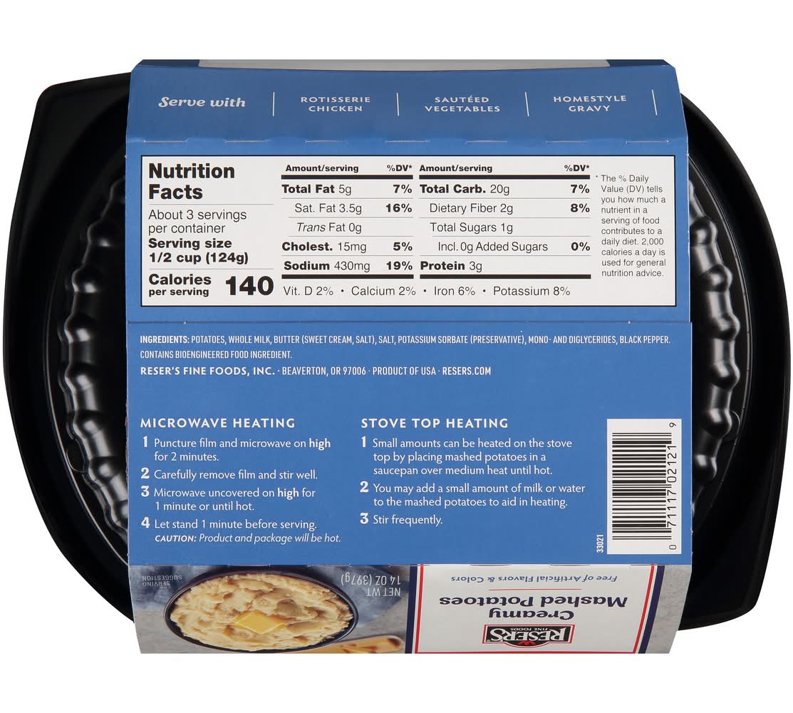 Microwave: microwave heating 1. puncture film and microwave on high for 2 minutes. 2. carefully remove film and stir well. 3. microwave uncovered on high for 1 minute or until hot. 4. let stand 1 minute before serving. caution: product and package will be hot. simmer: stove top heating 1. small amounts can be heated on the stove top by placing mashed potatoes in a saucepan over medium heat until hot. 2. you may add a small amount of milk or water to the mashed potatoes to aid in heating. 3. stir frequently. serve with: rotisserie chicken, sauteed vegetables, homestyle gravy. keep refrigerated.