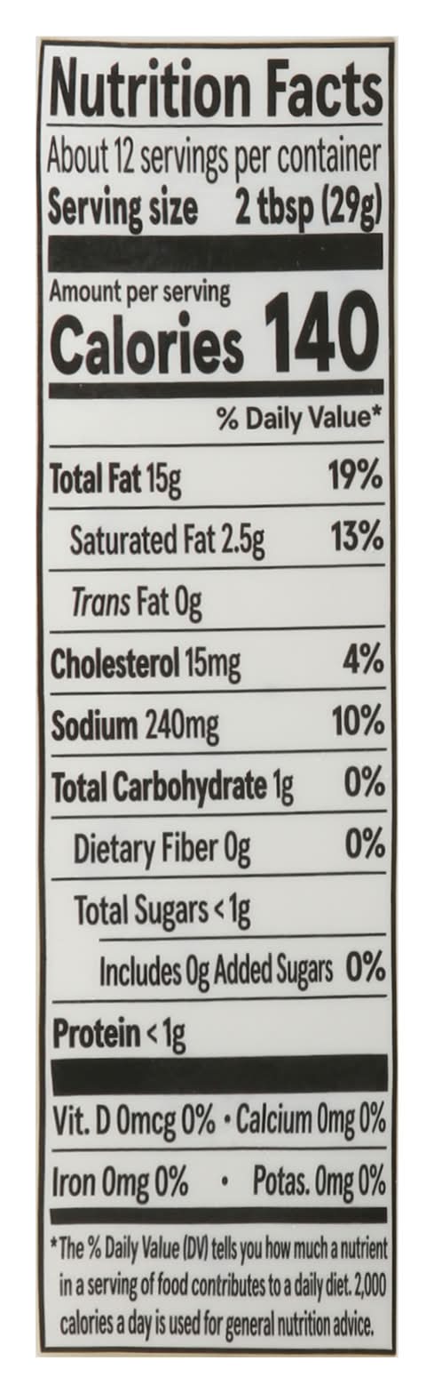 Ingredients: Soybean Oil Buttermilk Water Sour Cream (Cream, Modified Corn Starch, Lactic Acid, Gelatin, Guar Gum, Mono and Diglycerides, Sodium Phosphate, Acetic Acid, Citric Acid, Phosphoric Acid, Natural & Artificial Flavors) Distilled Vinegar, Egg Yolk Salt Garlic (Including Dehydrated) Sugar Buttermilk (Dehydrated) Glucono Delta Lactone Onion (Dehydrated) Potassium Sorbate and Sodium Benzoate Added as Preservatives, Mustard Seed Xanthan Gum Spice Green Onion (Dehydrated) Calcium Disodium EDTA Added to Protect Flavor. Contains: Eggs, Milk, Soybeans, Corn, Mustard