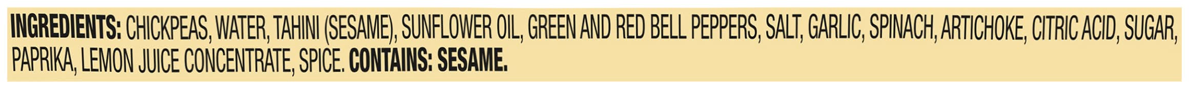 Ingredients: Chickpeas, Water, Tahini (Sesame), Sunflower Oil, Green and Red Bell Peppers, Salt, Garlic, Spinach, Artichoke, Citric Acid, Sugar, Paprika, Lemon Juice Concentrate, Spice Contains: Soybeans