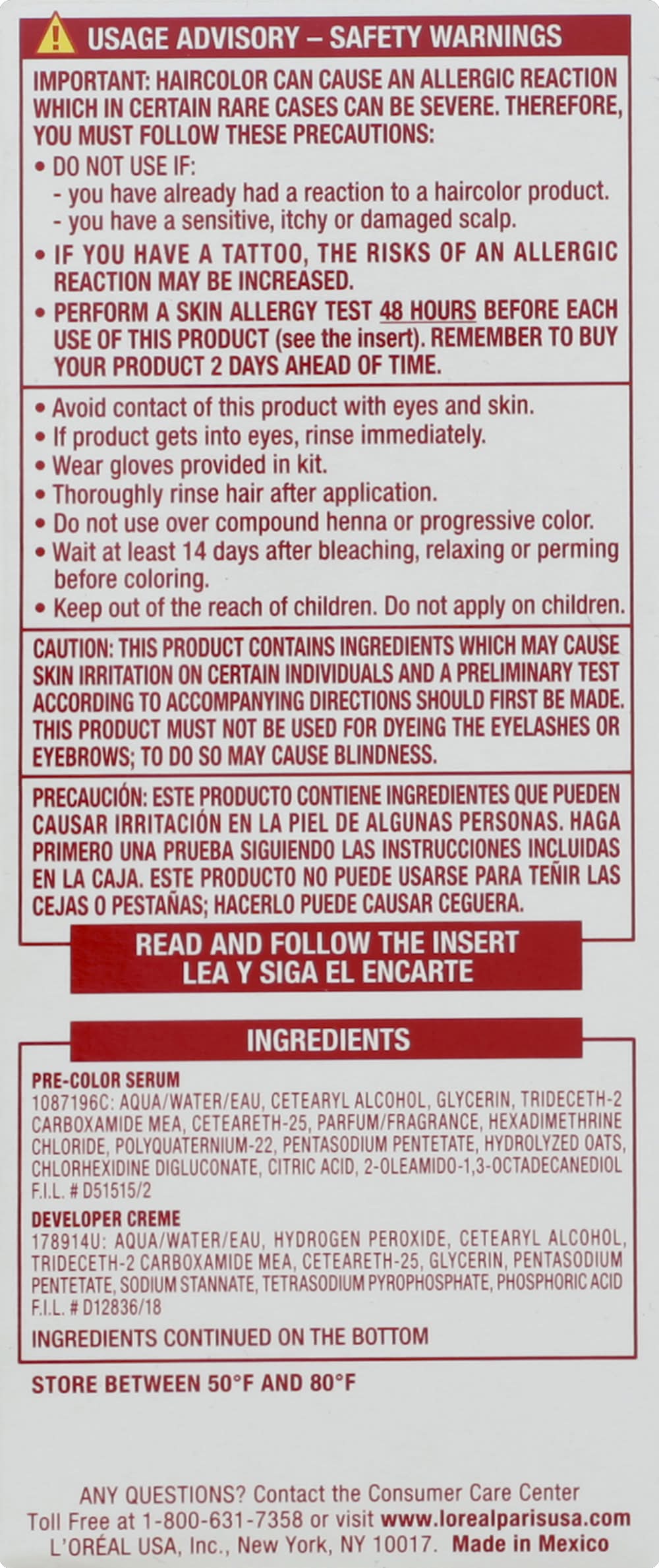 Ingredients: Pre-Color Serum: Aqua/Water/Eau, Cetearyl Alcohol, Glycerin, Trideceth-2 Carboxamide MEA, Ceteareth-25, Parfum/Fragrance, Hexadimethrine Chloride, Polyquaternium-22, Pentasodium Pentetate, Hydrolyzed Oats, Chlorhexidine Digluconate, Citric Acid, 2-Oleomido-, 3-Octadecanediol. Developer Creme: Aqua/Water/Eau, Hydrogen Peroxide, Cetearyl Alcohol, Trideceth-2, Carboxamide MEA, Ceteareth-25, Glycerin, Pentasodium Pentetate, Sodium Stannate, Tetrasodium Pyrophosphate, Phosphoric Acid. Permanent Color Creme: Aqua/Water/Eau, Cetearyl Alcohol, Propylene Glycol, Deceth-3, Laureth-12, Ammonium Hydroxide, Oleth-20, Hexadimethrine Chloride, Lauric Acid, Glycol Distearate, Polyquaternium-22, Ethanolamine, Silica Dimethyl Silylate, Co 77891/Titanium Dioxide, 2.4-Diaminophenoxyehtanol HCl, M-Aminophenol, Ascorbic Acid, Sodium Metabisulfite, Hydroxybenzomorpholine, Dimethicone, Pentasodium Pentetate, Proline, P-Phenylenediamine, Parfum/Fragrance, Carbomer, Threonine, Resorcinol. Conditioning Treatment: Aqua/Water/Eau, Cetearyl Alcohol, Glycerin, Behentrimonium Chloride, Amodimethicone, Cetyl Esters, Isopropyl Alcohol, Parfum/Fragrance, Sodium PCA, Trideceth-6, Panthenol, Candelilla Cera/Candelilla Wax/Cire De Candelilla, Cetrimonium Chloride, Chlorhexidine Dihydrochloride, Hydroxypropyltrimonium Hydrolyzed Wheat Protein, 2-Oleomido-1, 3-Octadecanediol, Soluble Collagen