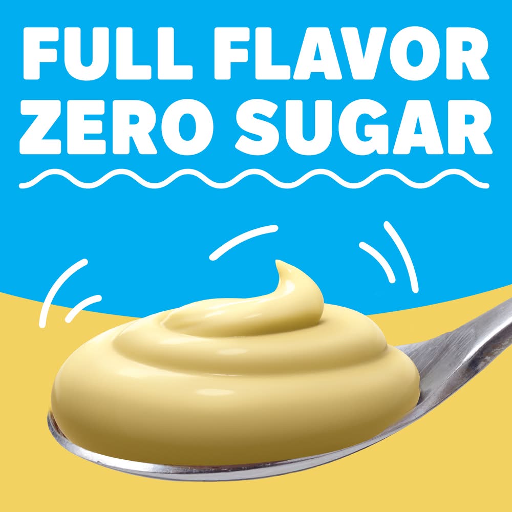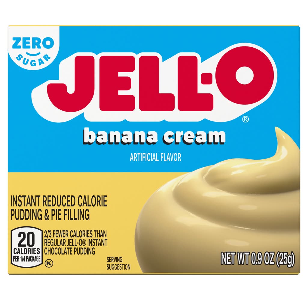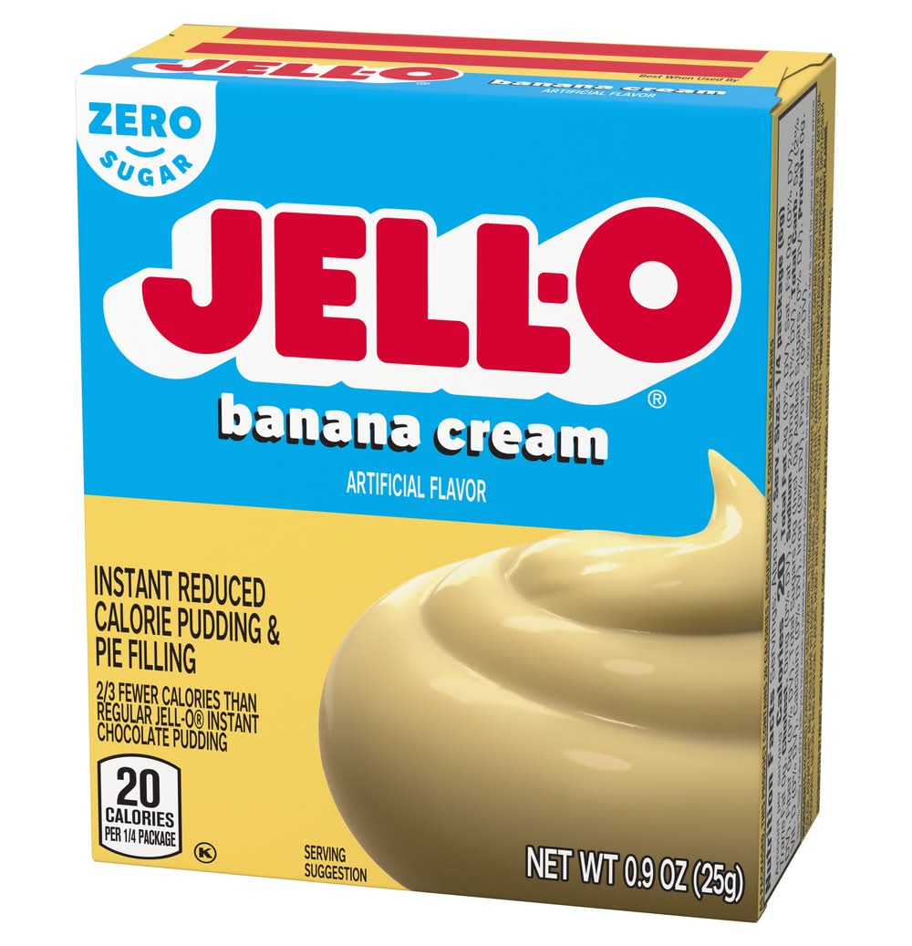 Snack happy. Jell-O Zero Sugar Banana Cream Artificially Flavored Instant Reduced Calorie Pudding Mix & Pie Filling tastes delicious whether you enjoy it as a treat or use it as an ingredient in your favorite dessert recipes. Add some wonder to your day with a delicious snack. Fun to make with your kids, our zero sugar artificially flavored banana cream pudding mix can also be used to create a poke cake, tasty crepes or banana cream pie filling. You'll feel good about serving our zero sugar pudding mix that is 2/3 fewer calories than regular Jell-O instant chocolate pudding; as packaged, this product contains 20 calories, regular product contains 100 calories. Our zero sugar artificially flavored banana cream pudding is ready in as little as five minutes. Simply stir milk into the pudding mix and allow to set. Every zero sugar Jell-O pudding mix comes packaged in a 0.9-ounce sealed pouch. Pudding fun in every bite.