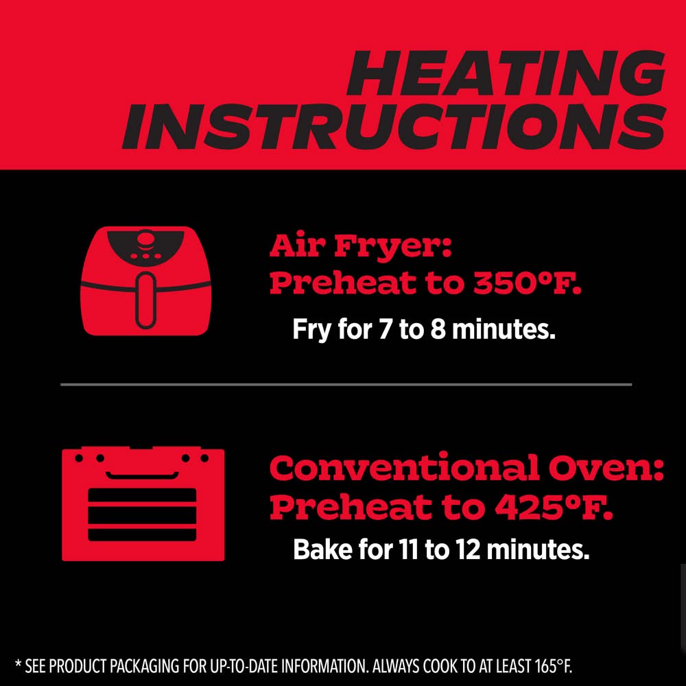 Directions for use: Conventional Oven: Preheat to 425 degrees F. 1. Remove rangoons from carton and inner wrapper. 2. Place rangoons on a foil lined baking tray. 3. Heat for 11 to 12 minutes. Turn product over half way through heating. 4. Let stand 2 minutes before serving. (Caution: Tray and product will be hot). Air Fryer: Preheat fryer to 350 degrees F. 1. Remove rangoons from carton and inner wrapper. 2. Place rangoons in fryer basket. 3. Heat for 7 to 8 minutes. Turn product over half way through heating. 4. Let stand 2 minutes before serving. Caution: Product will be hot! Place sauce packet(s) in lukewarm water until thawed. For food safety and quality heat before eating to an internal temperature of 170 degrees F. Prepare from frozen state. Appliances vary, adjust time and temperature accordingly. Refrigerate or discard any unused portions. Keep frozen. Storage recommendation: Keep frozen
