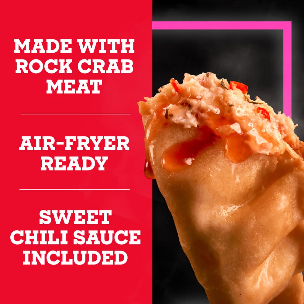 Ingredients: INGREDIENTS: WRAPPER: ENRICHED FLOUR (WHEAT FLOUR, MALTED BARLEY FLOUR, NIACIN, REDUCED IRON, THIAMINE MONONITRATE, RIBOFLAVIN, FOLIC ACID), WATER, ENRICHED DURUM FLOUR (WHEAT FLOUR, NIACIN, FERROUS SULFATE, THIAMINE MONONITRATE, RIBOFLAVIN, FOLIC ACID), CONTAINS 2% OR LESS OF: SALT, YELLOW CORN FLOUR, DRIED WHOLE EGGS, VEGETABLE OIL (COTTONSEED, SOYBEAN AND/OR CANOLA OIL), WHEAT GLUTEN, SUGAR, LEAVENING (SODIUM ACID PYROPHOSPHATE, BAKING SODA), DEXTROSE, ANNATTO (COLOR). FILLING: CREAM CHEESE (PASTEURIZED MILK AND CREAM, CHEESE CULTURE, SALT, CAROB BEAN GUM, GUAR GUM), CRAB MEAT, BELL PEPPERS, YELLOW ONION, WHOLE MILK (VITAMIN D3 ADDED), WATER, CARROTS, WHITE RICE, MODIFIED FOOD STARCH, SUGAR, CONTAINS 2% OR LESS OF: SALT, SOY SAUCE (WHEAT, SOYBEANS, SALT), DRIED GARLIC, WORCESTERSHIRE SAUCE (VINEGAR, MOLASSES, WATER, CORN SYRUP, SALT, CARAMEL COLOR, SUGAR, SPICES, ANCHOVY, NATURAL FLAVOR [SOY], TAMARIND EXTRACT, SOY LECITHIN), MALTODEXTRIN, SPICE, XANTHAN GUM. FRIED IN VEGETABLE OIL (COTTONSEED, SOYBEAN AND/OR CANOLA OIL). SWEET CHILI SAUCE: SUGAR, WATER, VINEGAR, CHILI PEPPER, SALT, CONTAINS 2% OR LESS OF: RED JALAPENO PEPPERS, DRIED GARLIC, MODIFIED FOOD STARCH, CITRIC ACID, XANTHAN GUM, OLEORESIN PAPRIKA. Contains: Milk, Eggs, Wheat, Soy, Fish (Anchovy), Crustaceans