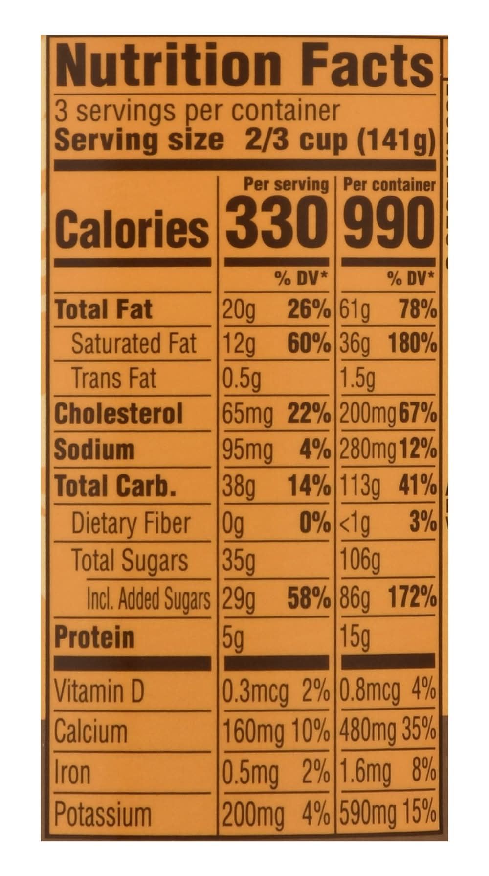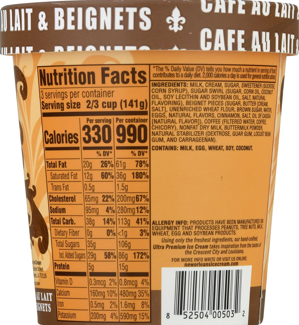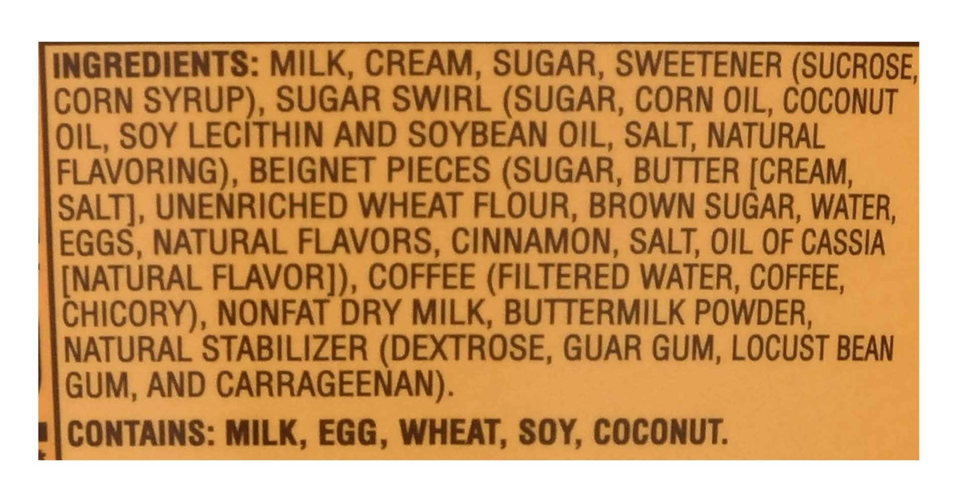 Ingredients: Milk, Cream, Sugar, Sweetener (Sucrose Corn Syrup), Sugar, Swirl (Sugar Corn Oil Coconut Oil Soy Lecithin and Soybean Oil Salt Natural Flavoring), Beignet Pieces (Sugar Butter [C)ream, Salt], Unenriched Wheat, Brown Sugar, Water, Eggs, Natural Flavors, Cinnamon, Salt, Oil of Cassia [Natural Flavor]), Coffee (Filtered Water Coffee Chicory), Nonfat Dry Milk, Buttermilk Powder, Natural Stabilizer (Dextrose Guar Gum Locust Bean Gum and Carrageenan) Contains: Milk, Eggs, Wheat, Soybeans, Tree Nuts