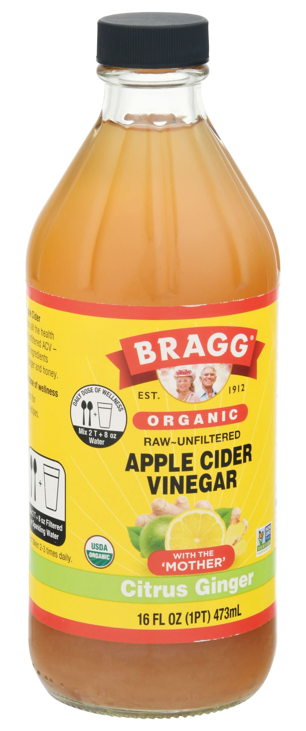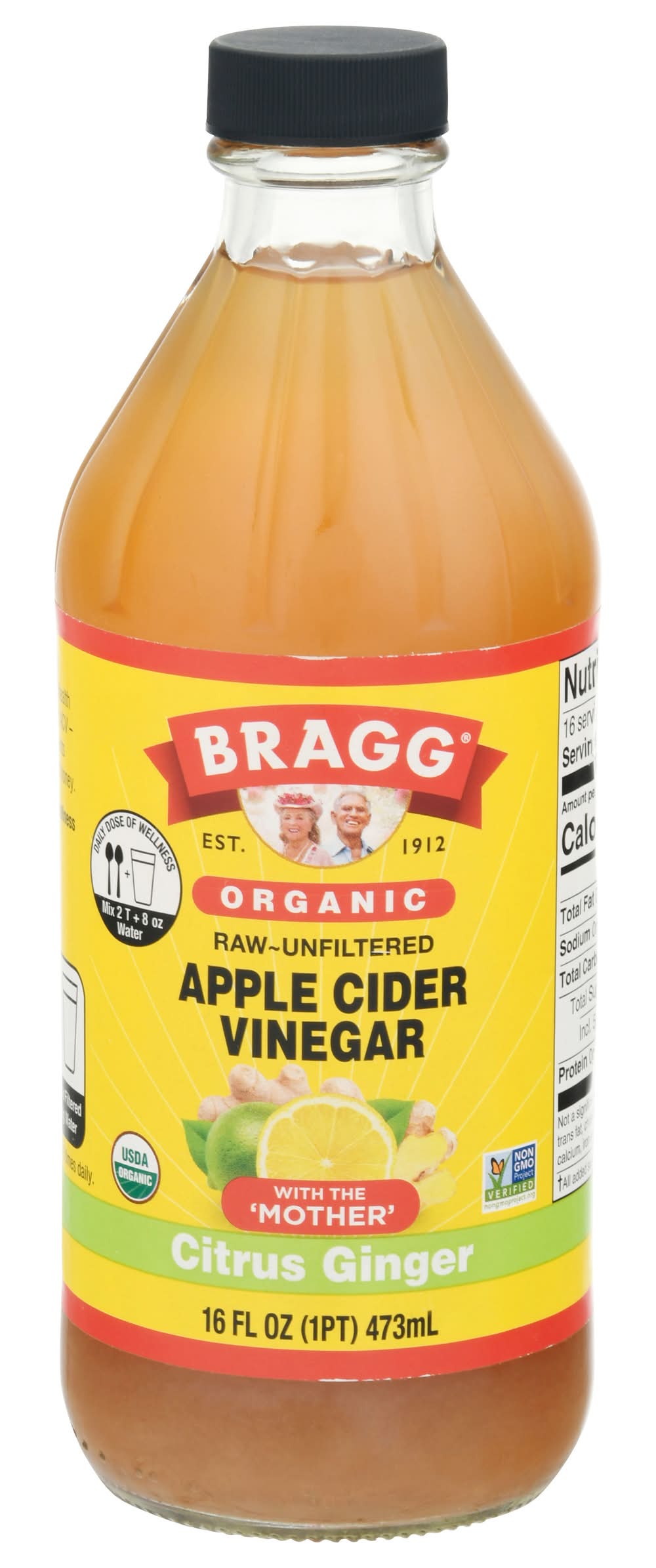 Apple Cider Vinegar, Organic, Citrus Ginger • Flavor: Citrus ginger • Number of servings: 16 • Bragg Live Food Products, Llc, Santa Barbara, CA, 93101 • Packaging: Reusable