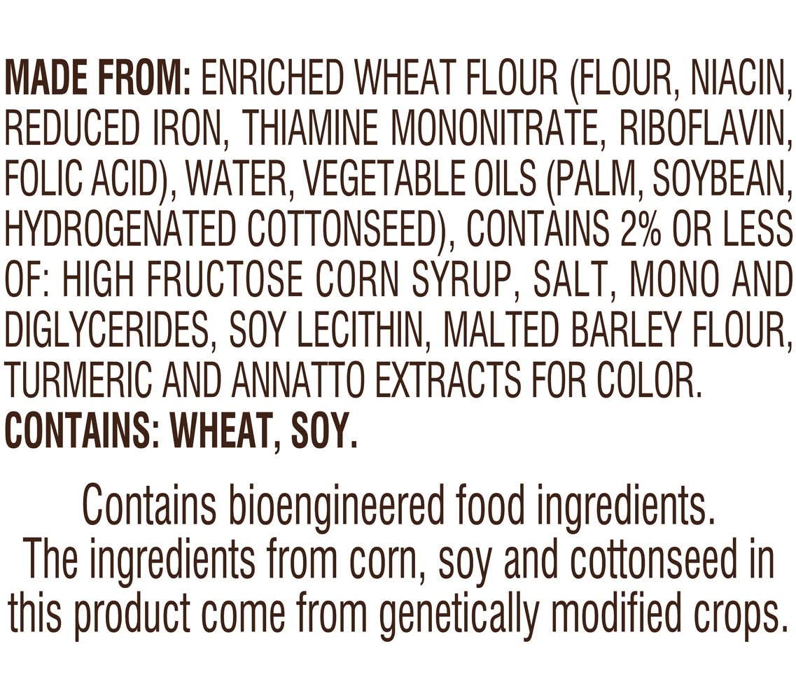 Ingredients: MADE FROM: ENRICHED WHEAT FLOUR (FLOUR, NIACIN, REDUCED IRON, THIAMINE MONONITRATE, RIBOFLAVIN, FOLIC ACID), WATER, VEGETABLE OILS (PALM, SOYBEAN, HYDROGENATED COTTONSEED), CONTAINS 2% OR LESS OF: HIGH FRUCTOSE CORN SYRUP, SALT, MONO AND DIGLYCERIDES, SOY LECITHIN, MALTED BARLEY FLOUR, TURMERIC AND ANNATTO EXTRACTS FOR COLOR. CONTAINS: WHEAT, SOY. Contains: CONTAINS: Gluten, Soybean, Wheat