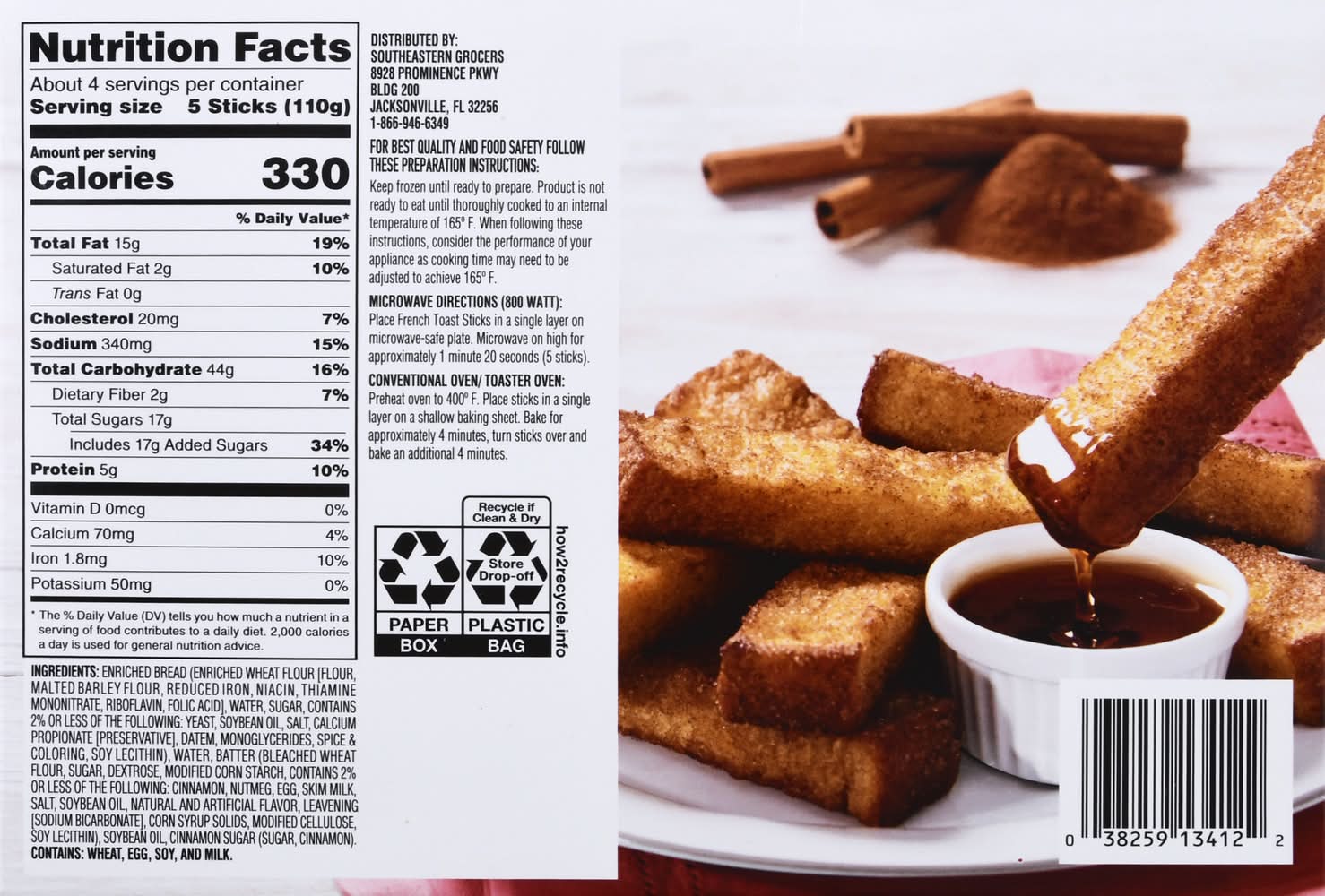 Per 110 g Serving: 330 calories; 2 g sat fat (10% DV); 340 mg sodium (15% DV); 17 g total sugars. See nutrition information for total fat content. how2recycle.info. • Southeastern Grocers, 8928 Prominence Pkwy,Bldg 200,Jacksonville,FL,32256 • Packaging: Reusable