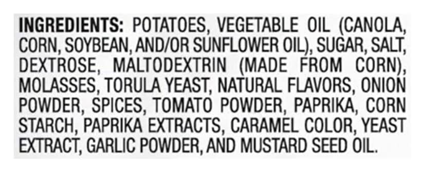 Ingredients: Potatoes, Vegetable Oil (Canola, Corn, Soybean, and/or Sunflower Oil), Sugar, Salt, Dextrose, Maltodextrin (Made from Corn), Molasses, Torula Yeast, Natural Flavors, Onion Powder, Spices, Tomato Powder, Paprika, Corn Starch, Paprika Extracts, Caramel Color, Yeast Extract, Garlic Powder, and Mustard Seed Oil Contains: Corn, Mustard, Soybeans