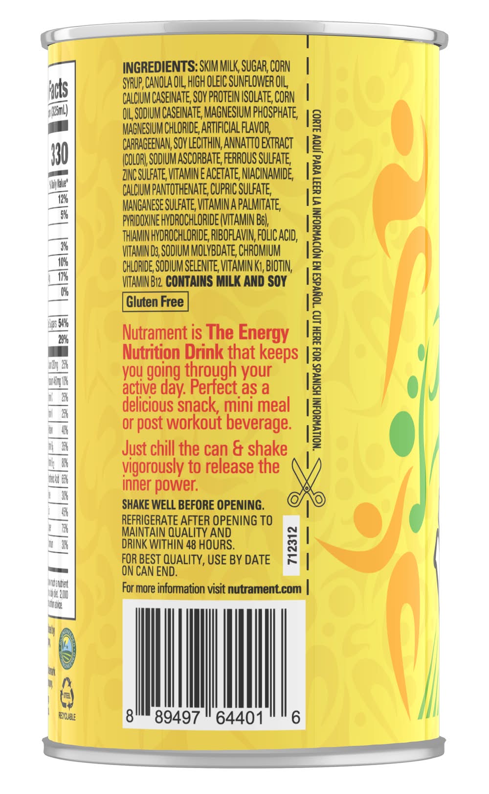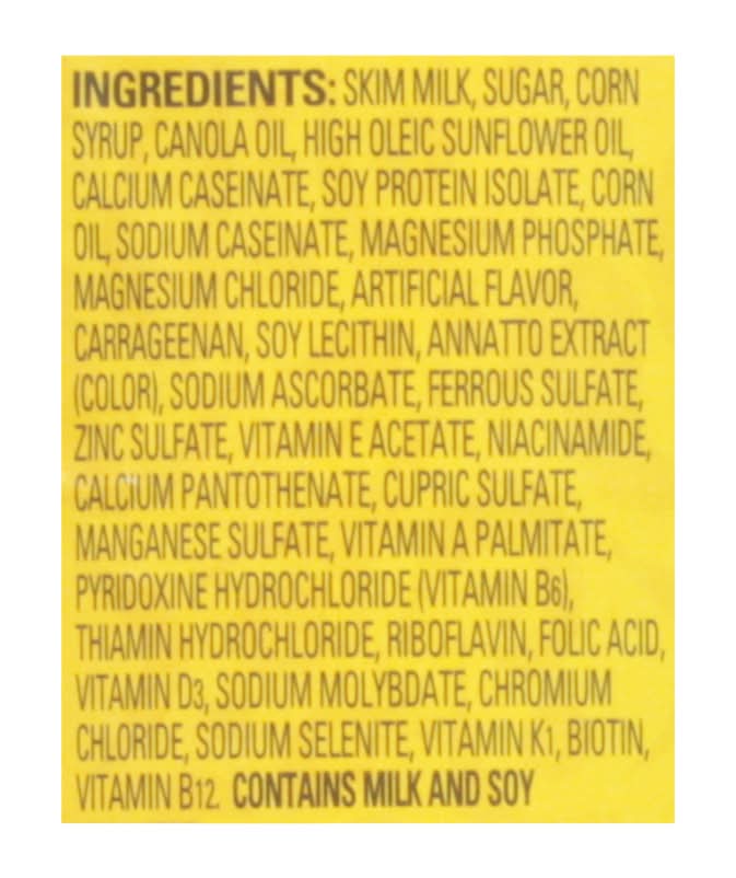 Ingredients: Skim Milk, Sugar, Corn Syrup, Canola Oil, High Oleic Sunflower Oil, Calcium Caseinate, Soy Protein Isolate, Corn Oil, Sodium Caseinate, Magnesium Phosphate, Magnesium Chloride, Artificial Flavor, Carrageenan, Soy Lecithin, Annatto Extract (Color), Sodium Ascorbate, Ferrous Sulfate, Zinc Sulfate, Vitamin E Acetate, Niacinamide, Calcium Pantothenate, Cupric Sulfate, Manganese Sulfate, Vitamin A palmitate, Pyridoxine Hydrochloride (Vitamin B6), Thiamin Hydrochloride, Riboflavin, Folic Acid, Vitamin D3, Sodium Molybdate, Chromium Chloride, Sodium Selenite, Vitamin K1, Biotin, Vitamin B12.
