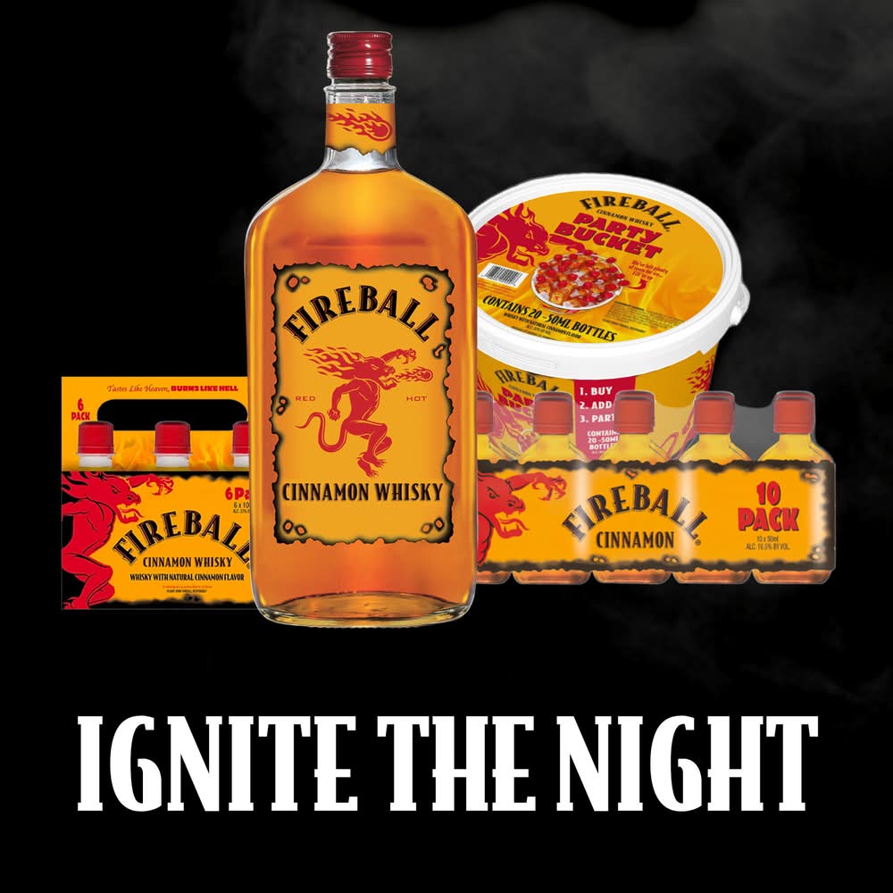 Ignite the Night with the heavenly taste and ferocious burn of a Fireball Cinnamon Wine Based Liqueur. From the makers of Fireball Cinnamon Whisky, America’s #1 shot brand and #1 whiskey brand, this grape wine-based alcoholic beverage is made with real cinnamon for a fiery kick of flavor. Fireball Cinnamon shot is the iconic choice for pregaming before a chill night out or celebrating with friends at your favorite bar. Fireball Cinnamon also tastes great when enjoyed straight or added to your favorite mixed drinks or a classic cocktail. The cinnamon flare of Fireball also enhances your favorite hard seltzer, hard cider and other alcoholic drinks. With countless ways to enjoy Fireball Cinnamon, bending the rules is easy - and delicious. Store Fireball at room temperature or store and pour straight from your fridge to enjoy a cool, spicy shot. Fireball is one of a kind, not to be replaced by any other copycat cinnamon whiskey. Fireball tastes like heaven and burns like hell. • Brand: Fireball • Category: Flavored whiskey • Alcohol by volume: 33% • Flavor: cinnamon • Liquor color: brown
