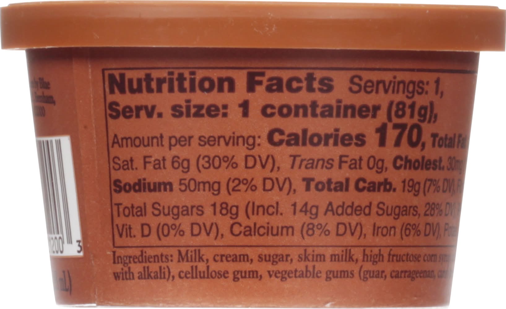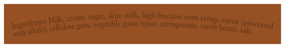 Ingredients: Milk, Cream, Sugar, Skim Milk, High Fructose Corn Syrup, Cocoa (Processed with Alkali), Cellulose Gum, Vegetable Gums (Guar, Carrageenan, Carob Bean), Salt Contains: Milk
