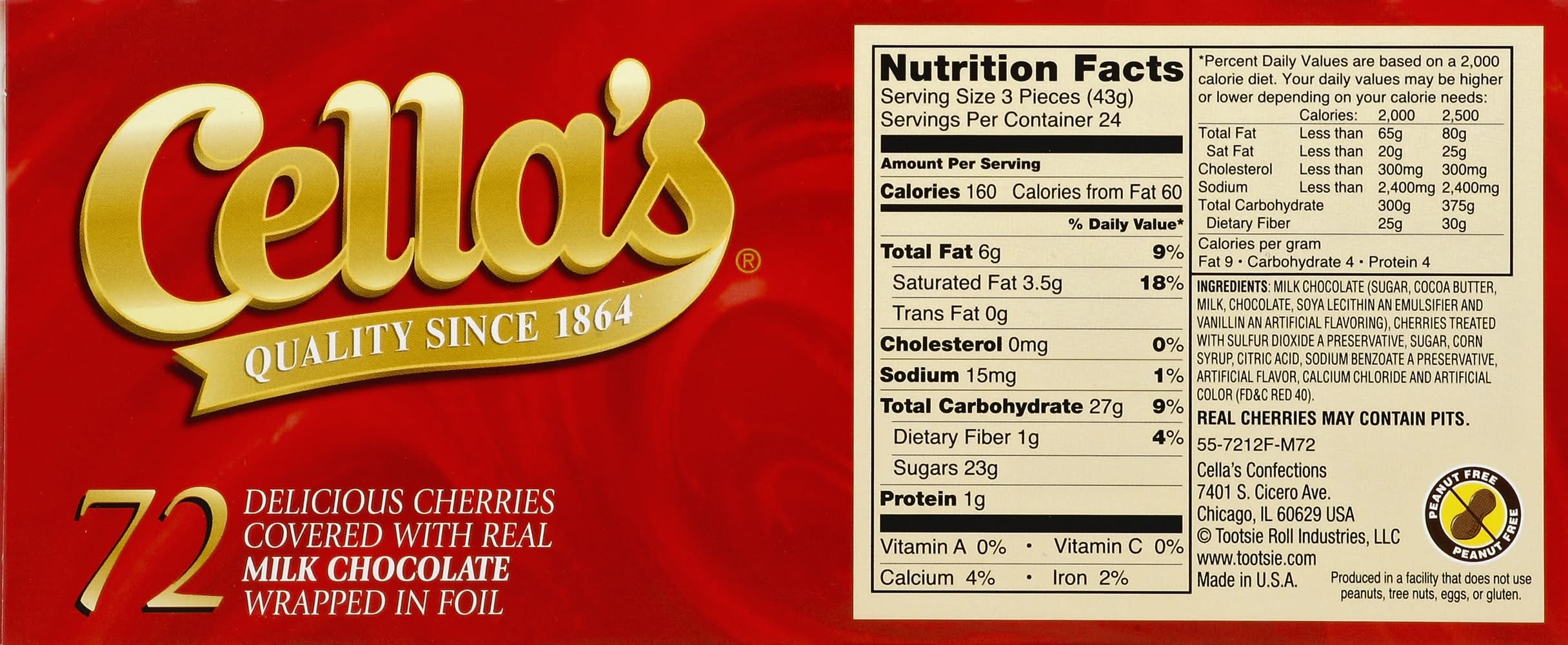 Ingredients: Milk Chocolate (Sugar, Cocoa Butter, Milk, Chocolate, Soya Lecithin an Emulsifier, and Vanillin, an Artificial Flavoring), Cherries Treated with Sulfur Dioxide a Preservative, Sugar, Corn Syrup, Citric Acid, Sodium Benzoate a Preservative, Artificial Flavor, Calcium Chloride and Artificial Color (FD&C Red 40) Contains: Milk, Soybeans