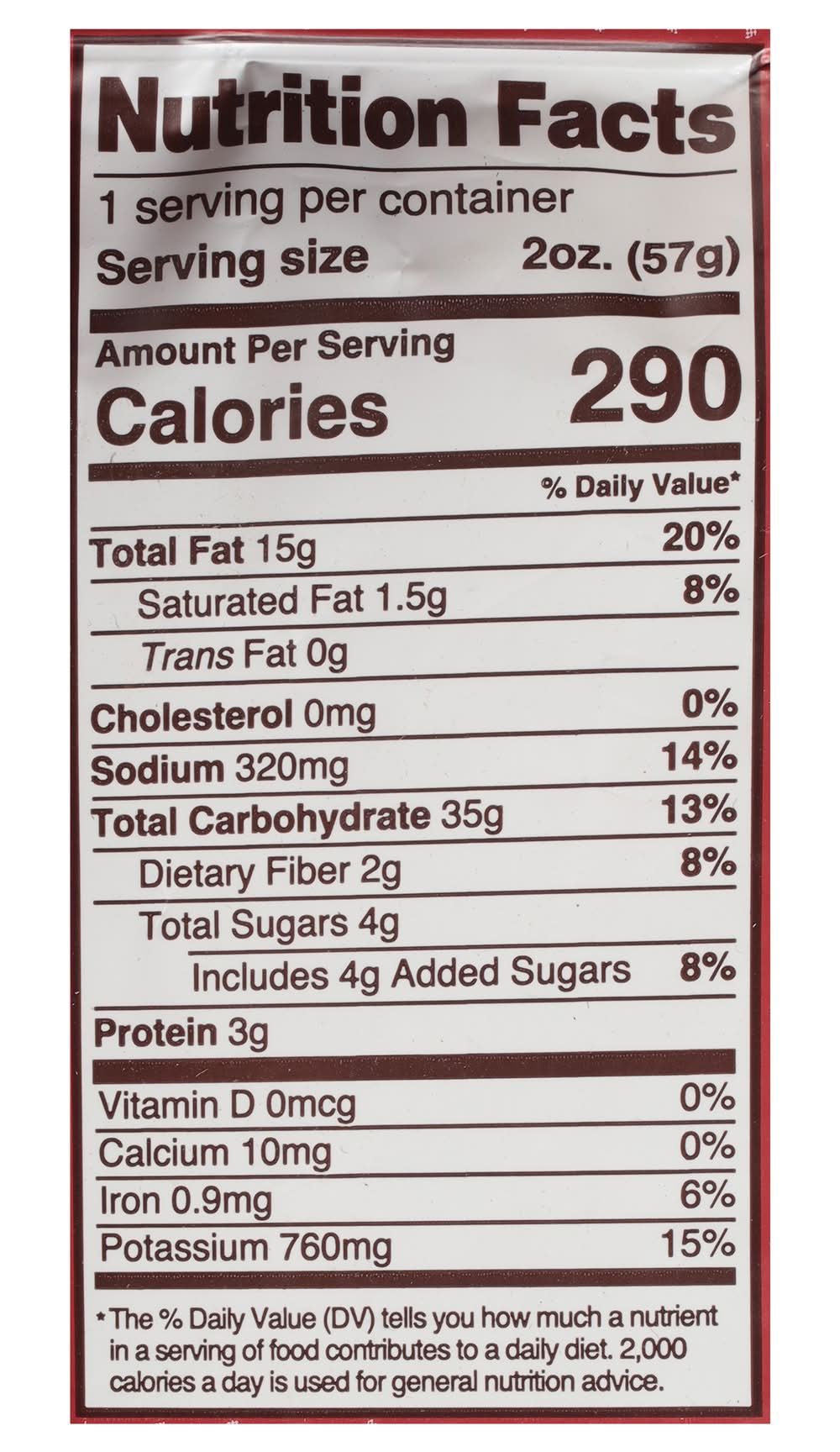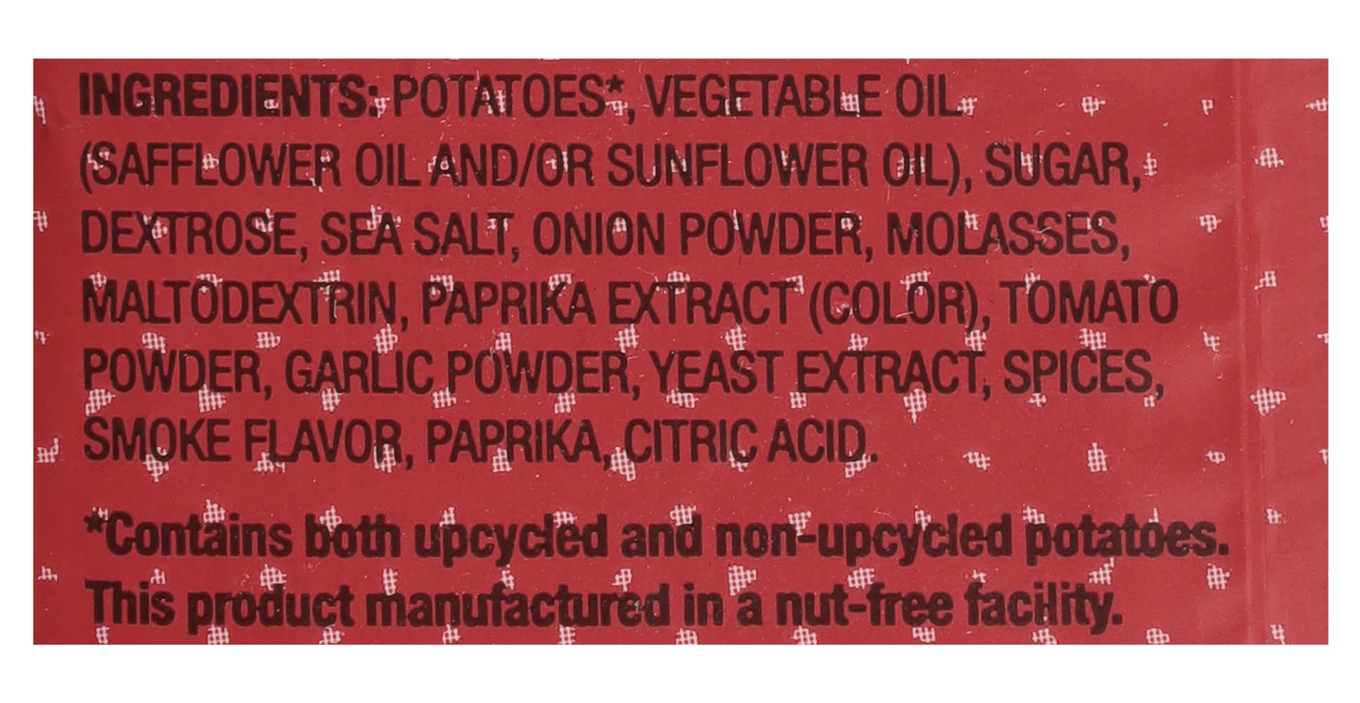Ingredients: Potatoes (Contains Both Upcycled and Non-Upcycled Potatoes, This Product Manufactured in a Nut-Free Facility), Vegetable Oil (Safflower Oil and/or Sunflower Oil), Sugar, Dextrose, Sea Salt, Onion Powder, Molasses, Maltodextrin, Paprika Extract (Color), Tomato Powder, Garlic Powder, Yeast Extract, Spices, Smoke Flavor, Paprika, Citric Acid