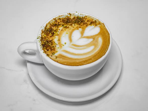 Pistachio sauce(made in house) smeared around the cup of a latte
