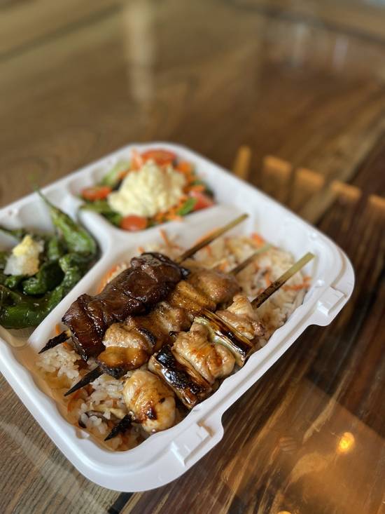 3 meat skewers (Momo chicken thigh, beef , Miso-glazed pork belly), salad, and Takikomi Gohan + a choice of appetizer