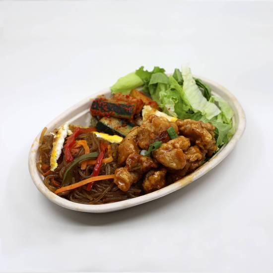 Chicken gangJung, Jobche, Salad, Cucumber Kimchi, Rice