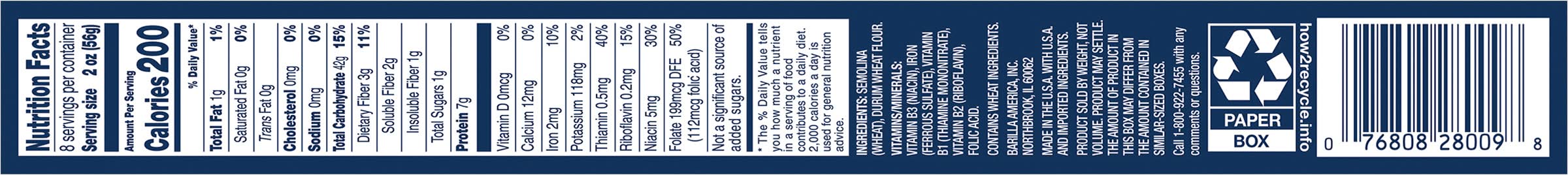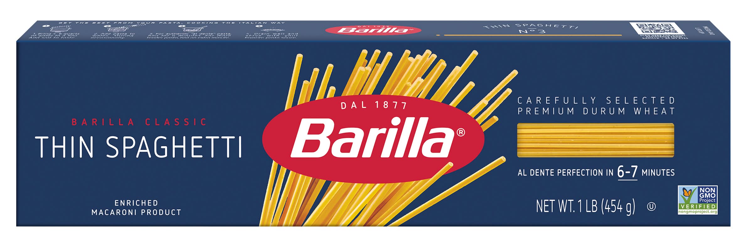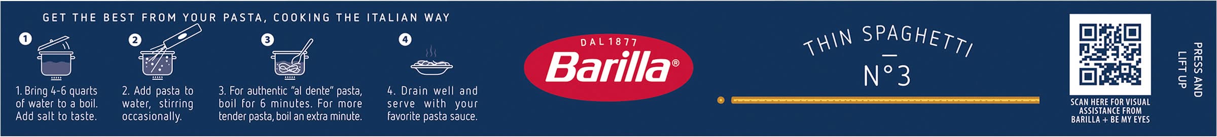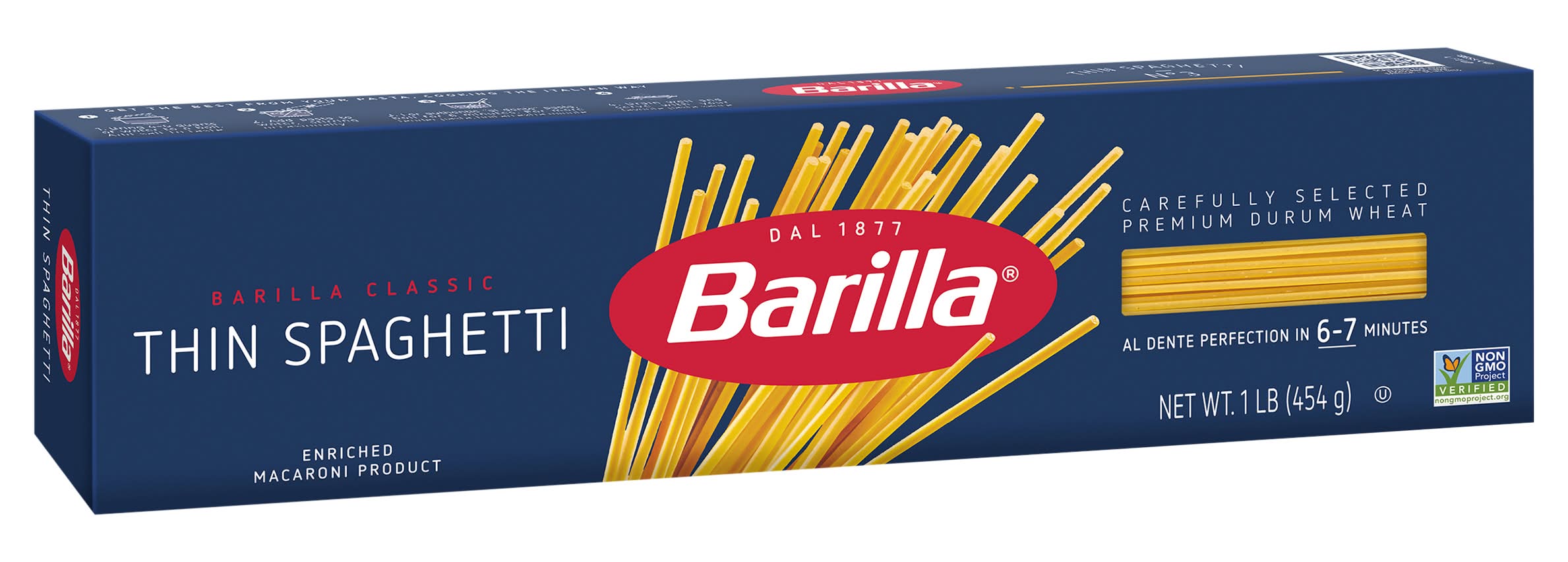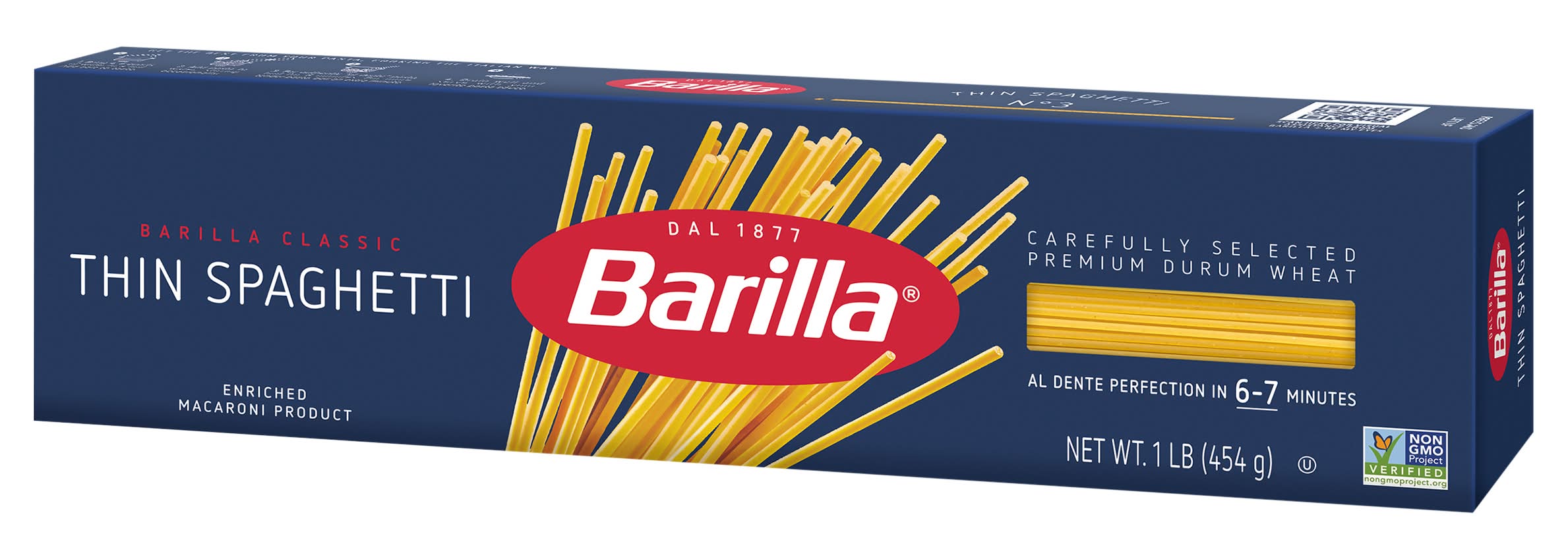 Enriched macaroni product. Non-GMO Project verified. Barilla Classic. Dal 1877. Carefully selected premium durum wheat. Al dente perfection in 6-7 minutes. Thin spaghetti with sun-dried tomatoes. Crafted with 140 years of pasta-making expertise and a custom blend of the highest quality wheat, Barilla is always committed to bringing you the best pasta. The result? Perfectly delicious and al dente pasta, every time. Product sold by weight, not volume. Product may settle. The amount of product in this box may differ from the amount contained in similar-sized boxes. Thin spaghetti no. 3. Barilla America, Inc., Northbrook,IL,60062