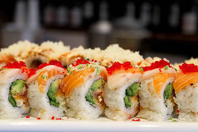 Inside: spicy tuna salmon and yellowtail, outside: tuna with sesame oil, eel sauce, sesame and scallions