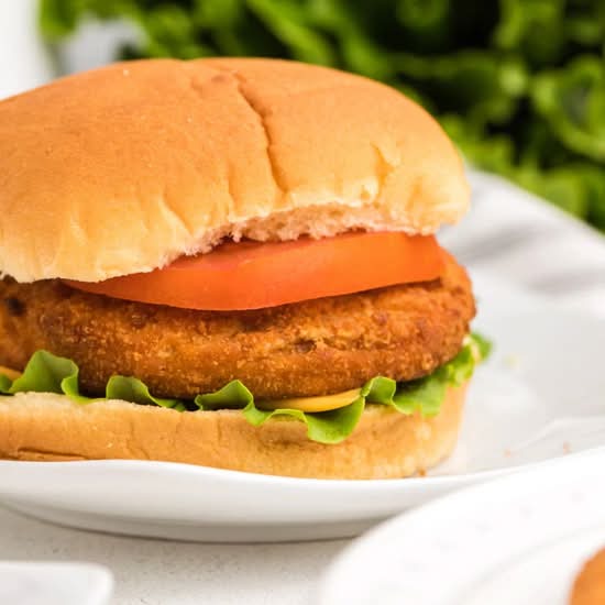 Toasted bun with mayo a chicken patty , tomato and lettuce.
