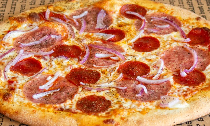 All-beef pepperoni, salami, cracked black pepper, and red onions.