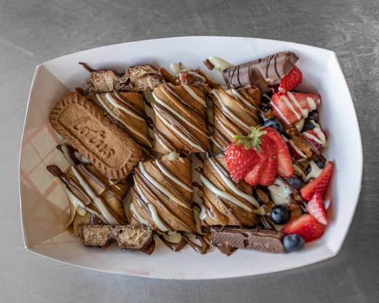Crepe filled with sushi-inspired ingredients, with choice of white, Nutella or Biscoff drip.