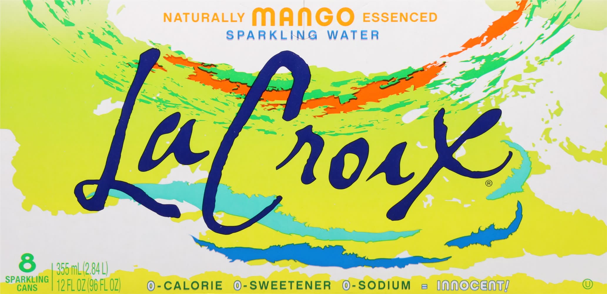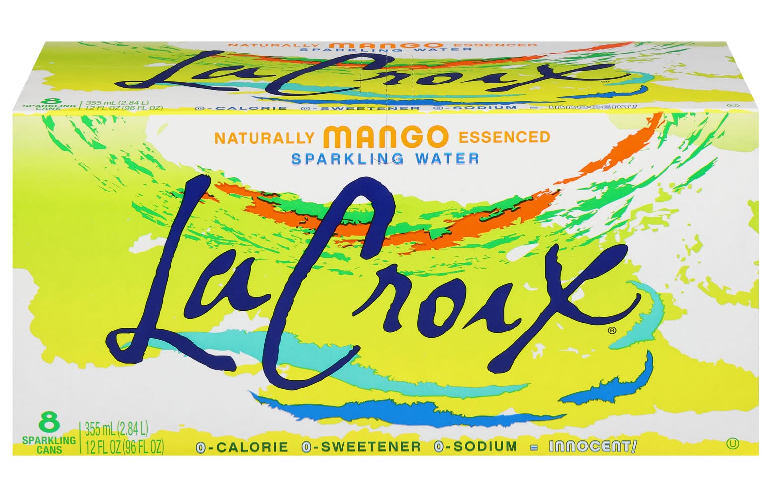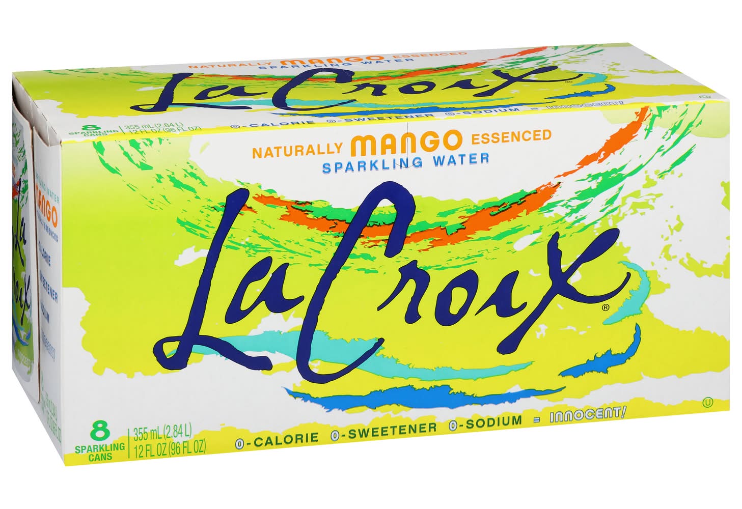 Sparkling Water, Mango • Pack size: 8 • LaCroix Beverages Inc., 26901 Industrial Blvd. Hayward, CA, 94545 • Packaging: Reusable