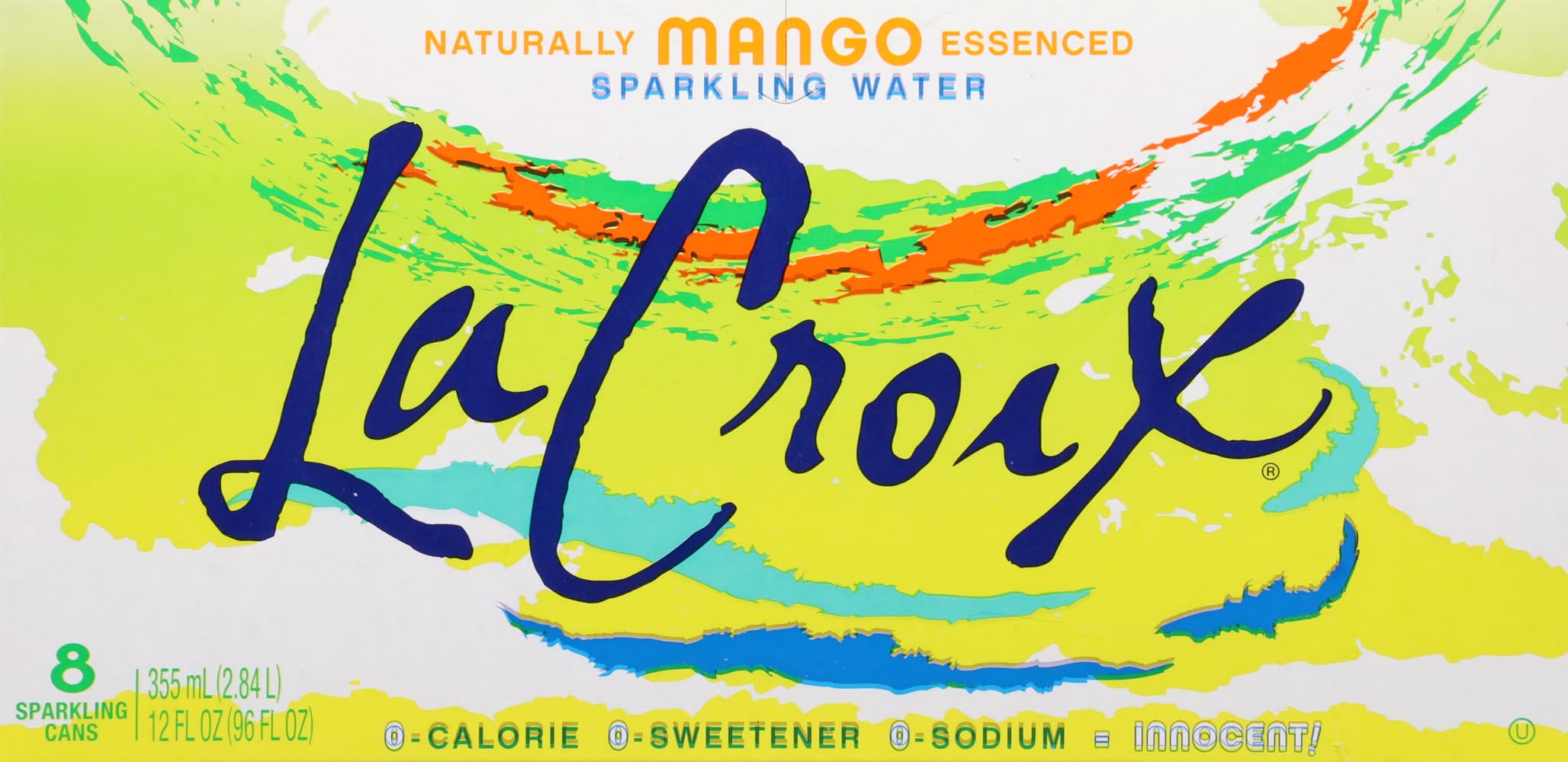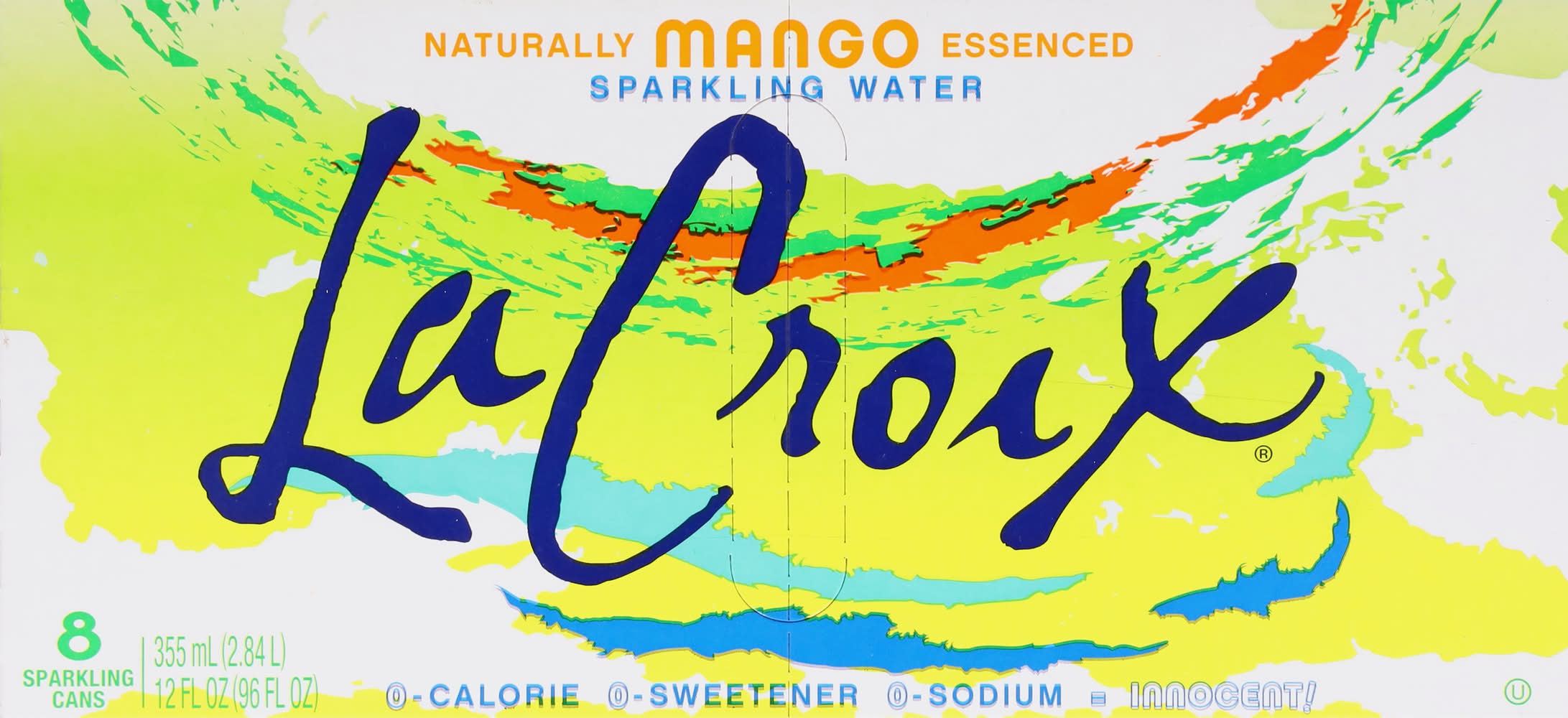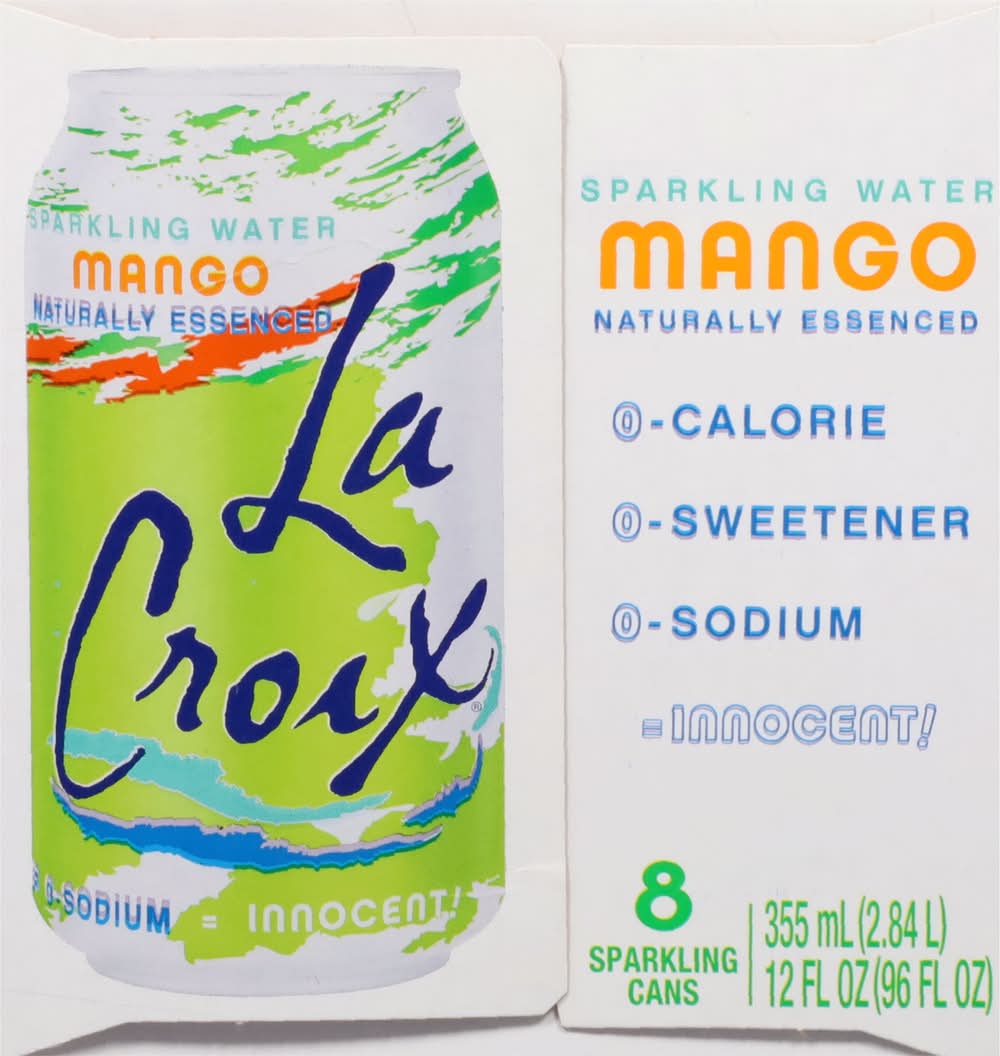 Sparkling Water, Mango • Pack size: 8 • LaCroix Beverages Inc., 26901 Industrial Blvd. Hayward, CA, 94545 • Packaging: Reusable