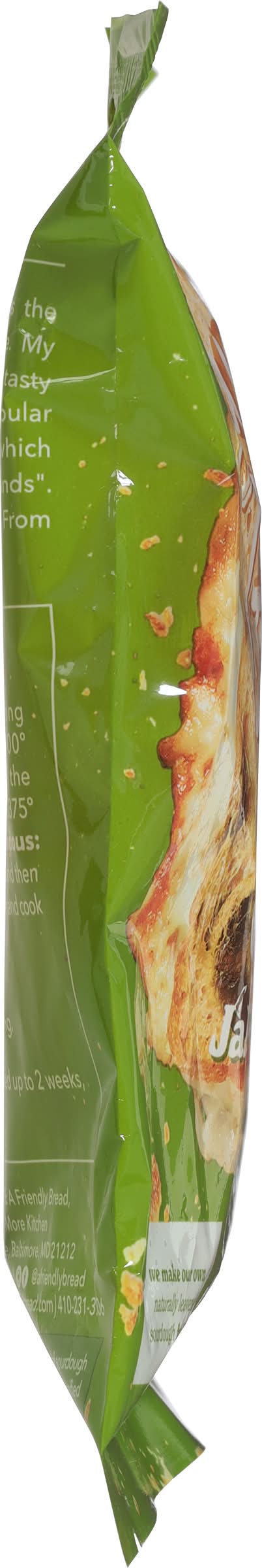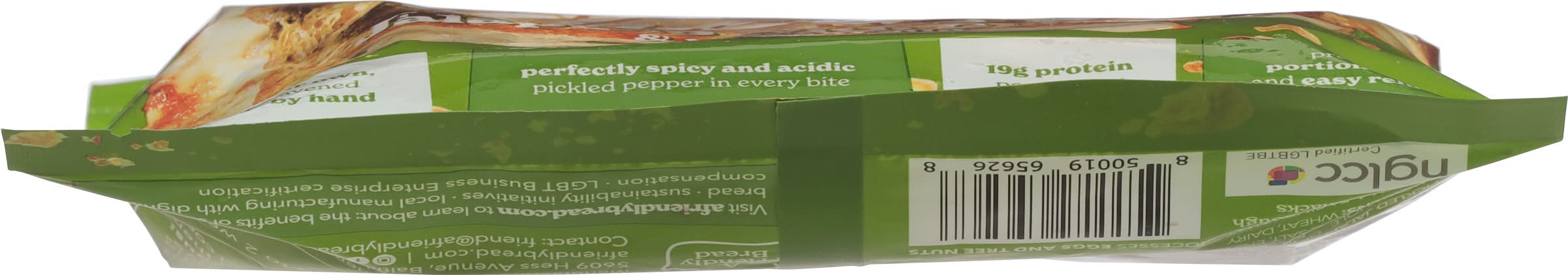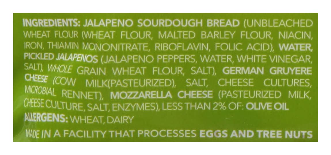 Ingredients: Jalapeno Sourdough Bread (Unbleached Wheat Flour (Wheat Flour, Malted Barley Flour, Niacin, Iron, Thiamin Mononitrate, Riboflavin, Folic Acid), Water, Pickled Jalapenos (Jalapeno Peppers, Water, White Vinegar, Salt), Whole Grain Wheat Flour, Salt), German Gruyere Cheese (Cow Milk(Pasteurized), Salt, Cheese Cultures, Microbial Rennet), Mozzarella Cheese (Pasteurized Milk, Cheese Culture, Salt, Enzymes), Less than 2% of: Olive Oil Contains: Wheat, Milk, Barley, Eggs, Tree Nuts