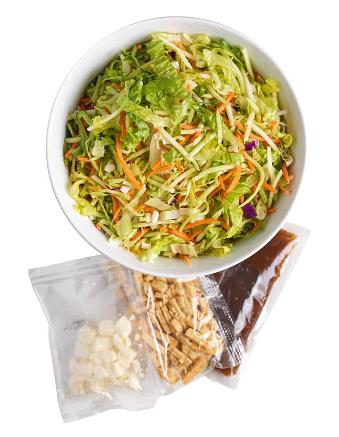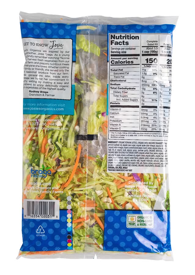 Ingredients: Organic Romaine Lettuce, Organic Basil, Organic Spices, Xanthan Gum, Organic Broccoli, Organic Carrot, Organic Herb Seasoned Flat Bread Strips (Organic Wheat Flour, Organic Palm Fruit Shortening, Organic Yeast, Organic Sunflower Oil, Organic Onion,Organic Garlic, Salt, Organic Maltodextrin, Organic Spices, Organic Tomato, Organic Butter Flavor, Organic Carrot, Organic Parsley, Organic Celery, Organic Paprika, Ascorbic Acid), Organic Feta Cheese (Organic Feta Cheese [Pasteurized Organic Mlik, Cheese Culture, ,Salt, Enzymes], Powdered Cellulose [To Prevent Caking]), Organic Red Cabbage, Organic Cauliflower, Organic Chicory