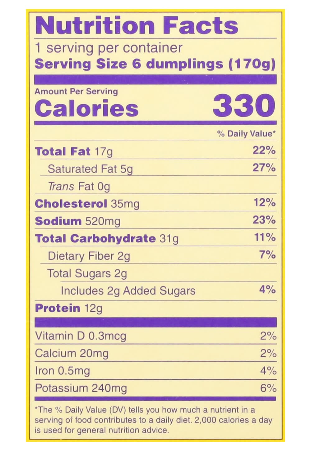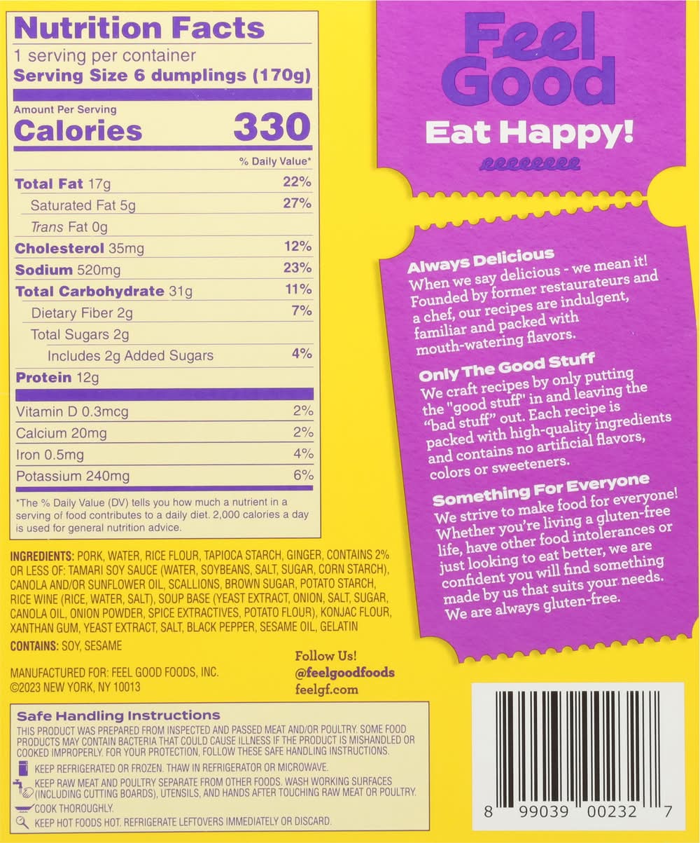 Ingredients: Pork, Water, Rice Flour, Tapioca Starch, Ginger, Contains 2% or Less of: Tamari Soy Sauce (Water, Soybeans, Salt, Sugar, Corn Starch), Canola and/or Sunflower Oil, Scallions, Brown Sugar, Potato Starch, Rice Wine (Rice, Water, Salt), Soup Base (Yeast Extract, Onion, Salt, Sugar, Canola Oil, Onion Powder, Spice Extractives, Potato Flour), Konjac Flour, Xanthan Gum, Yeast Extract, Salt, Black Pepper, Sesame Oil, Gelatin Contains: Soybeans, Sesame, Corn