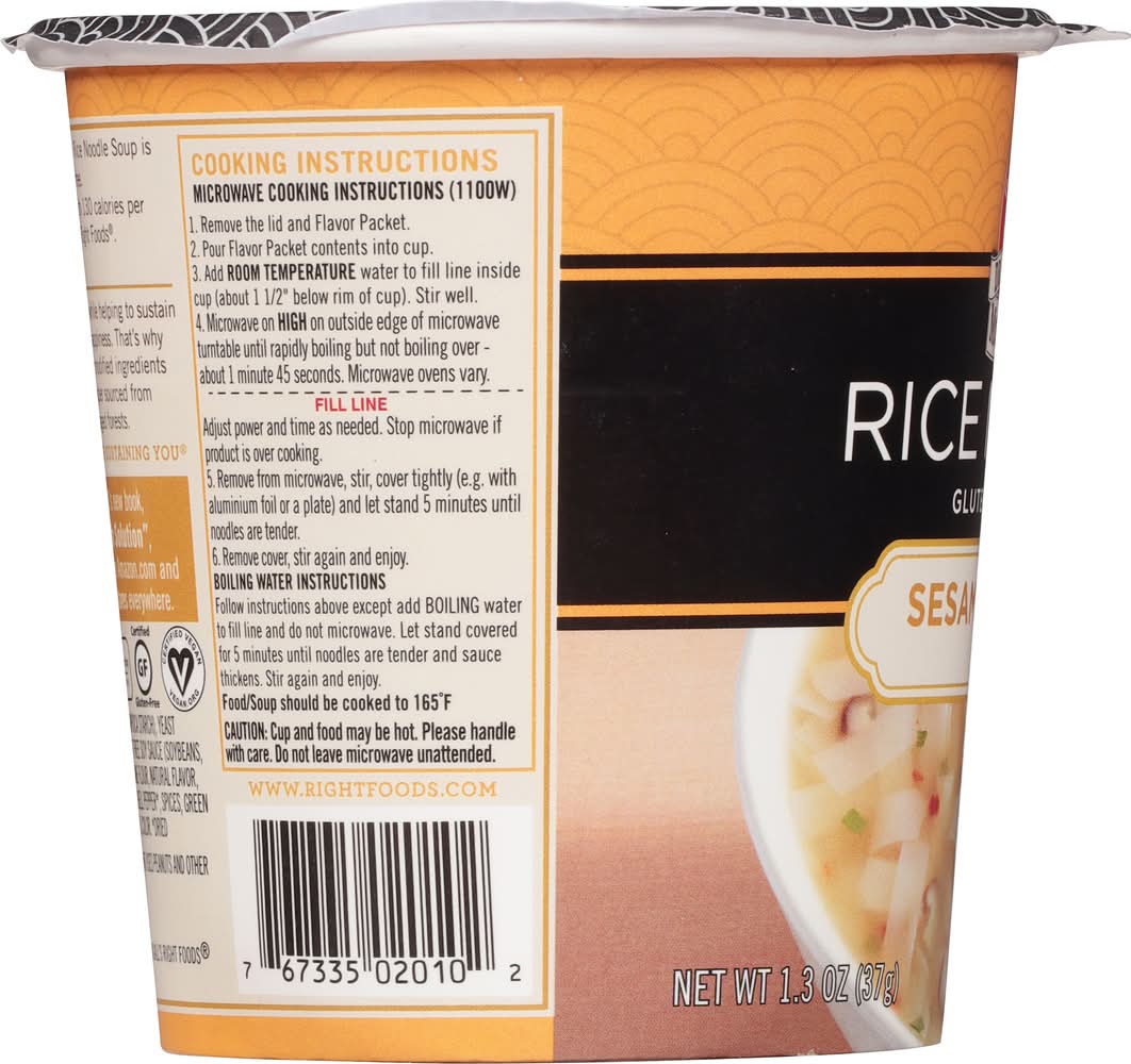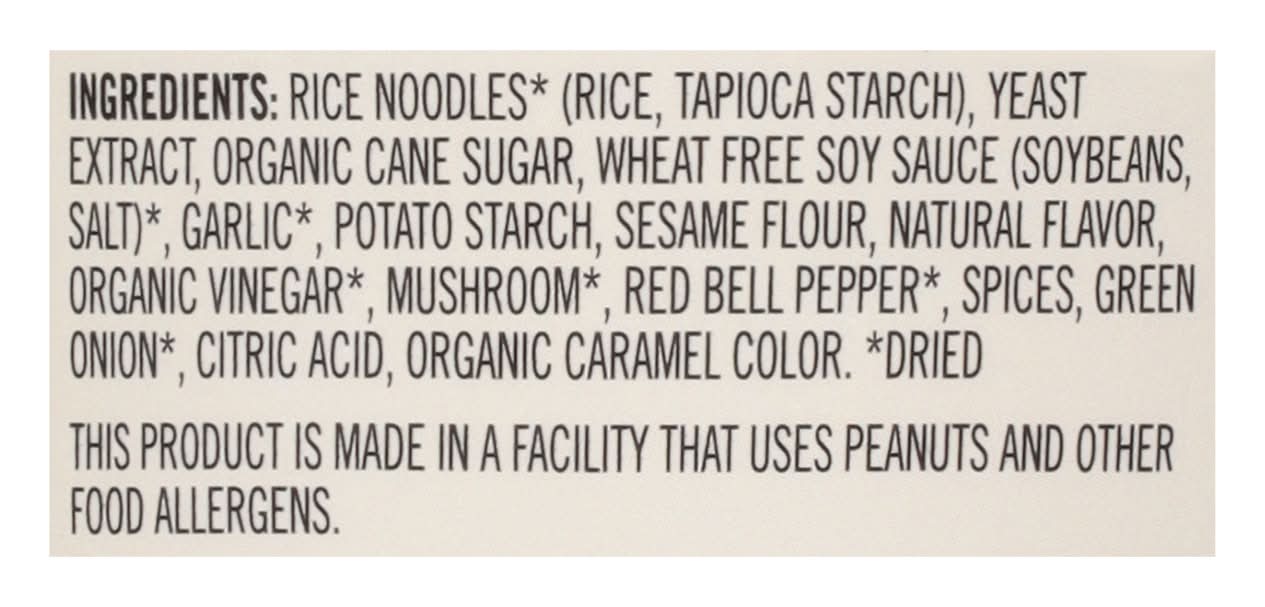 Ingredients: Rice Noodles (Dried) (Rice, Tapioca Starch), Yeast Extract, Organic Cane Sugar, Wheat Free Soy Sauce (Soybeans Salt) (Dried), Garlic (Dried), Potato Starch, Sesame Flour, Natural Flavor, Organic Vinegar (Dried), Mushroom (Dried), Red Bell Pepper (Dried), Spices, Green Onion (Dried), Citric Acid, Organic Caramel Color Contains: Wheat, Soybeans, Sesame, Peanuts