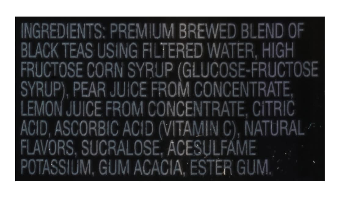 Ingredients: Premium Brewed Blend of Black Teas Using Filtered Water, High Fructose Corn Syrup (Glucose-Fructose Syrup), Lemon Juice from Concentrate, Pear Juice from Concentrate, Citric Acid, Ascorbic Acid (Vitamin C), Natural Flavors, Sucralose, Acesulfame Potassium, Gum Acacia, Ester Gum Contains: Corn