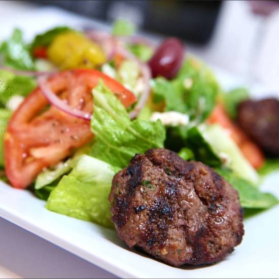 Greek salad, regular size, topped with four keftethes - Zorba's Mediterranean meatballs, served with a house roll.