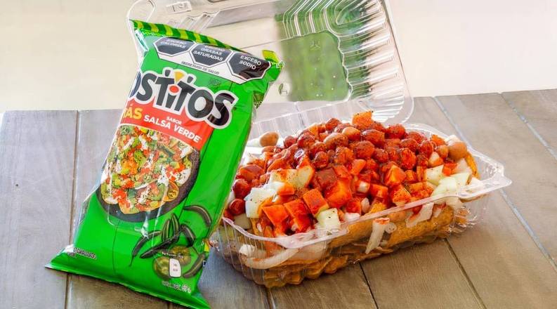 Tostitos Chips, Pickled pork skins, Chamoy, Tajín, Hot sauce, Peanuts, Cucumbers and Jicama chunks.