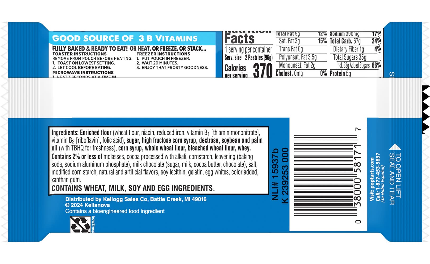 Pop-Tarts toaster pastries are the perfect sweet treat at breakfast, for lunch snack time, or dessert. Featuring a sweet s'mores-flavored filling and delicious frosting on a soft pastry crust, this ready to eat treat is perfect for snack time for kids and adults on the go. Pack Pop-Tarts Frosted S'mores in lunchboxes or backpacks when it's time for school snacking, or stock the office pantry with this individually wrapped grab and go adult snack time choice. Pop them in the toaster and pair with milk, create your own ice cream sandwiches, or incorporate into your favorite dessert recipe for a sweet treat. These irresistible snack time options for kids and adults provide a good source of three B vitamins. Stock your pantry with these shelf stable snack alternatives and enjoy ready to eat treats anytime. A flavor for everyone, including beloved classics like Frosted Strawberry or Frosted Cherry, or our more indulgent flavors, Frosted Cookies and Creme or Frosted Chocolate Fudge. • Marca: Pop-tarts • Sabor: S'mores